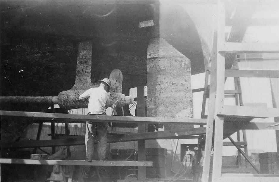 c. 1945 Starboard shaft strut packing glands being removed in dry dock at Pearl Harbor |