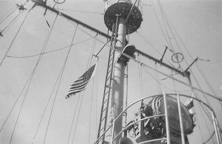 Being approached by a liberty boat. Note the movie screen rigged on the forecastle. |