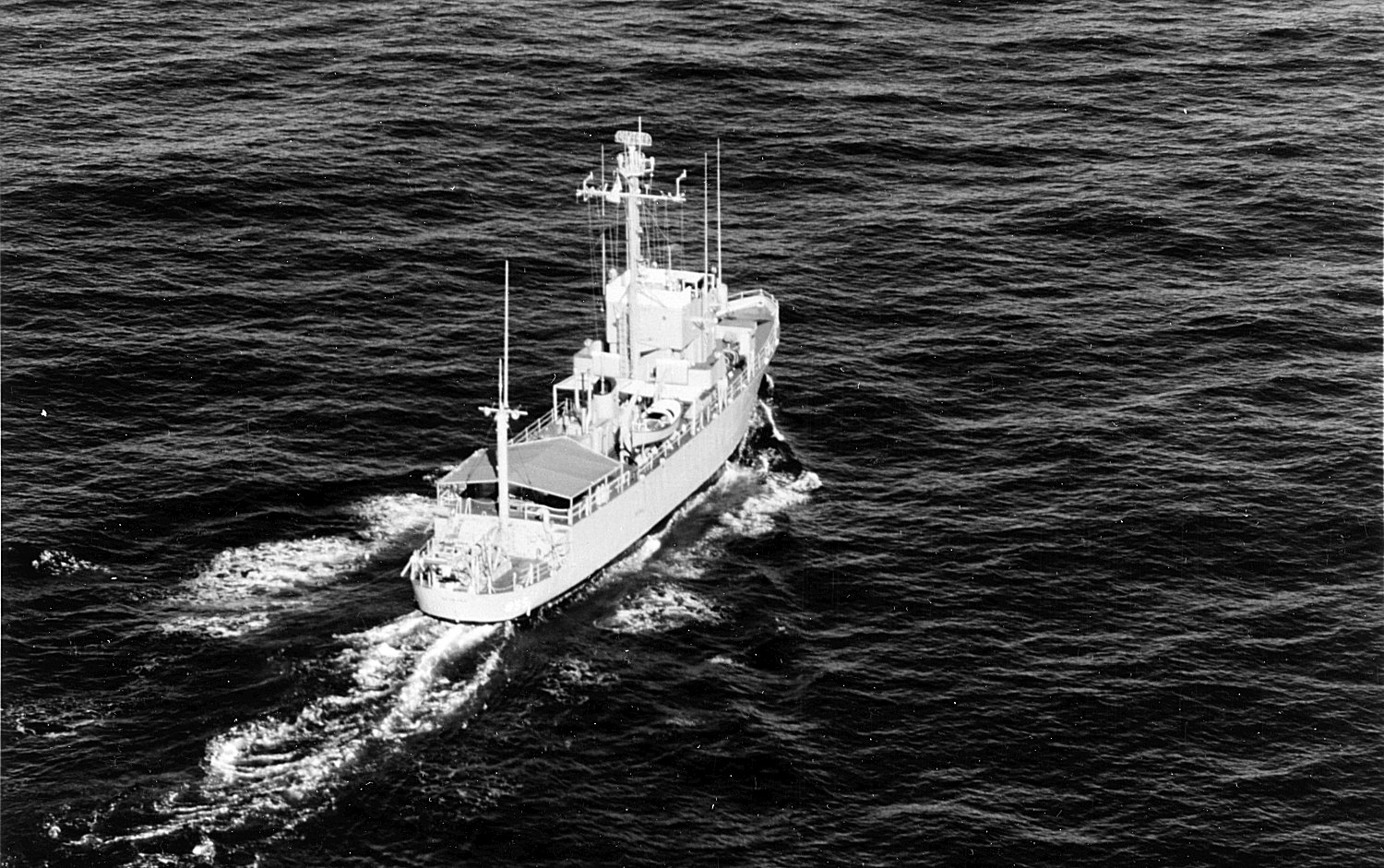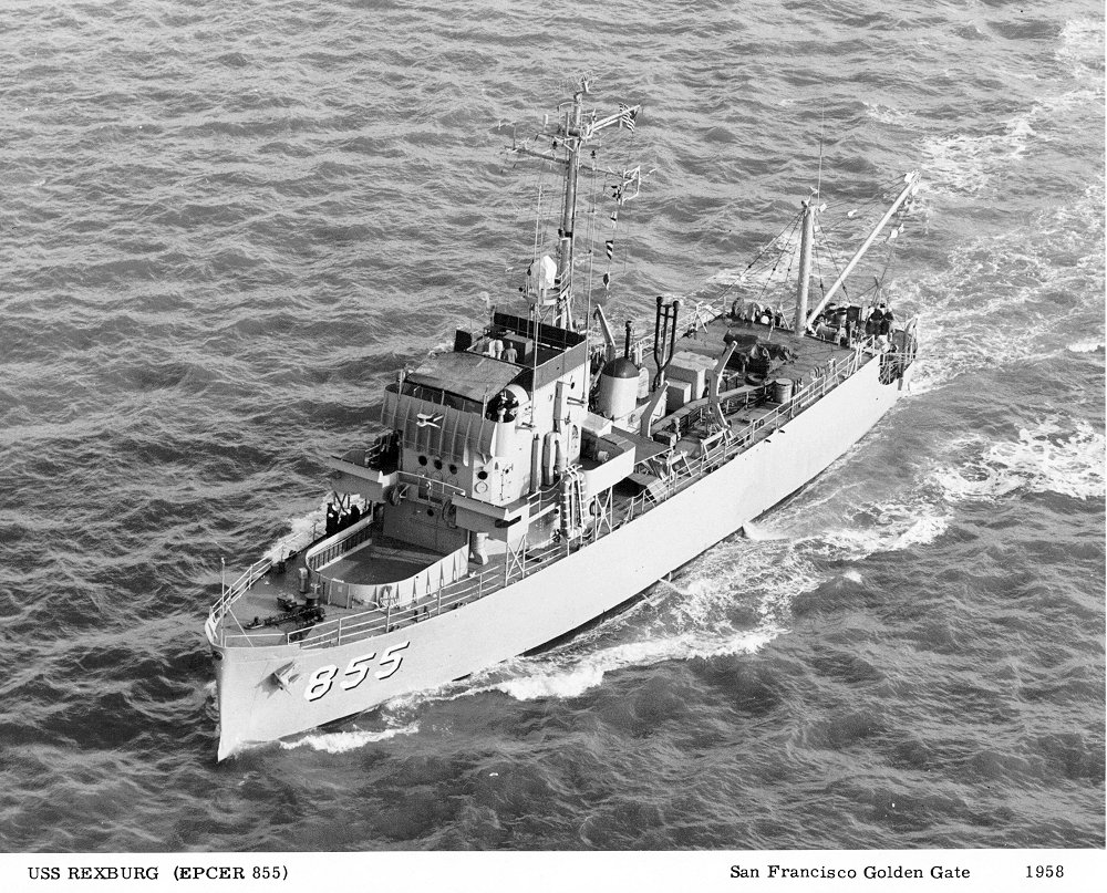 Rexburg (EPCER 855) as an experimental ship, armament removed and a heavy boom installed at her stern to handle equipment for underwater sound experiments U.S. Navy photo from the Dictionary of American Naval Fighting Ships |