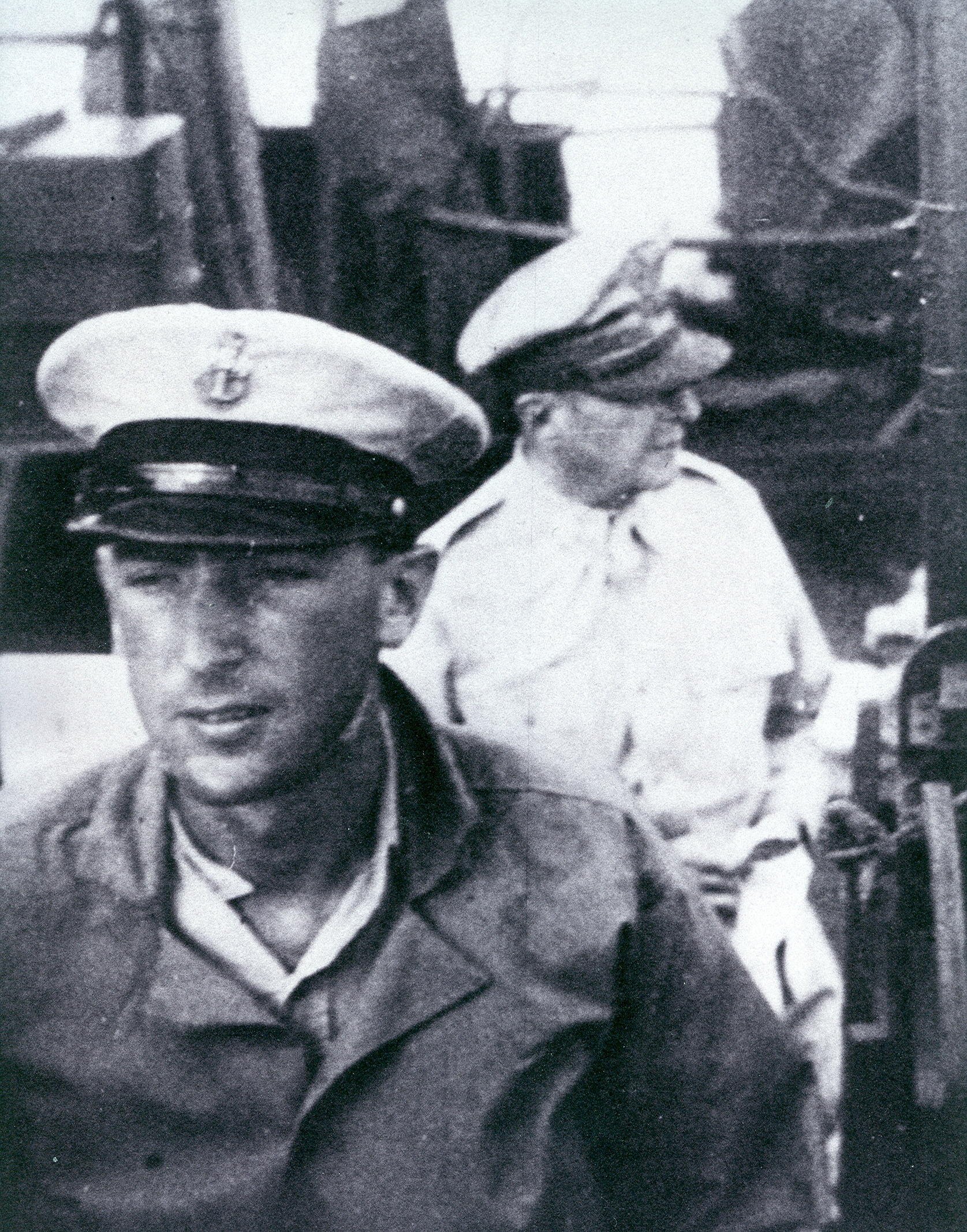 c. Summer 1945 En route from Samar to Negros, Philippines. General of the Army Douglas MacArthur on left with CO of PT-490 |