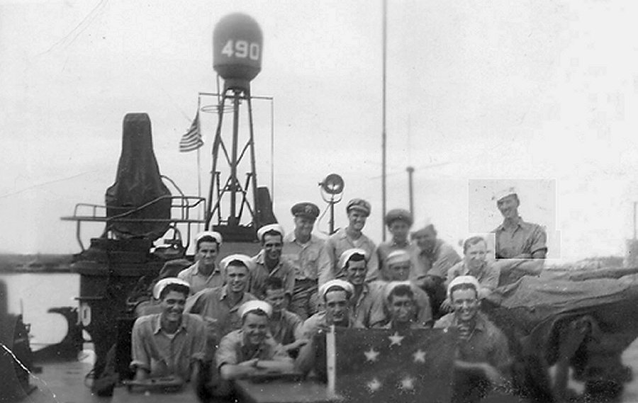 c. Summer 1945 En route to Negros, Philippines. General of the Army Douglas MacArthur behind QMC Al McCready. Chief McCready was asked by the CO (an ENS) of the PT 490 to pilot the boat while the General was aboard since he was a superior boat handler and navigator. The PT 490 had a very junior navigator on board and the ENS did not want to get lost between Samar and Negros. So he asked Chief McCready, the Squadron Chief, (who was not assigned to that boat normally) to come on board to make sure it all went smoothly. When asked if the General had spoken to him at all during the trip, apparently all he said was “Is everything under control, Chief?” and that was about it. |