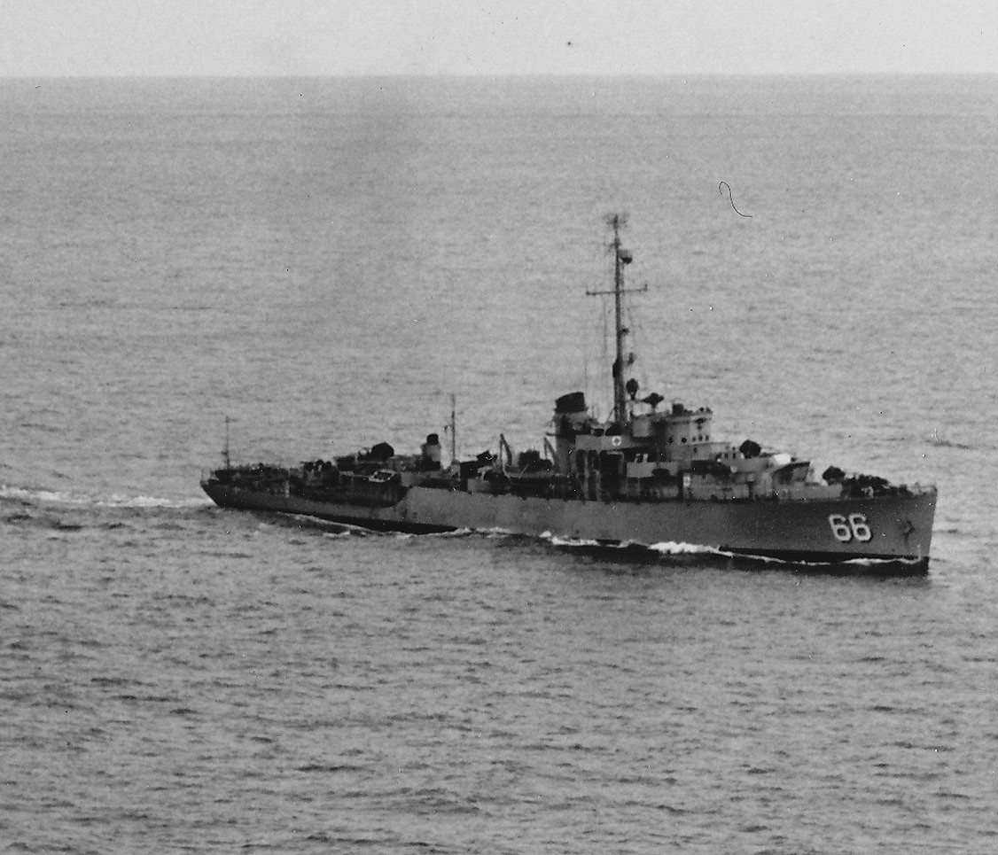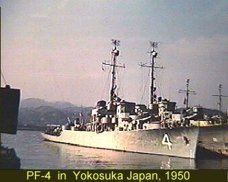 Seen here in service as the South Korean Frigate Imchin (PF 66) outboard of USS Lewis Hancock (DD 675), USS McGowan (DD 678), USS The Sullivans (DD 537), and USS Ajax (AR 6). Sasebo, Japan, 14 December 1952 National Archives photo 80-G-478507 |