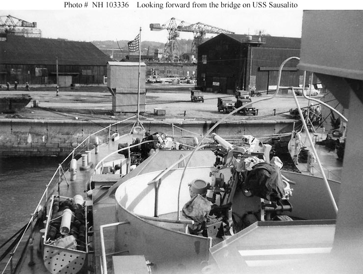 View looking forward from the ship's port bridge wing, circa 1952. Probably taken at Yokosuka, Japan. Photographed by James Edward Taylor, who was then a member of Sausalito's crew Collection of James Edward Taylor Courtesy of his wife, Mary A. Taylor, 2005 Naval History and Heritage Command photo NH 103336 |