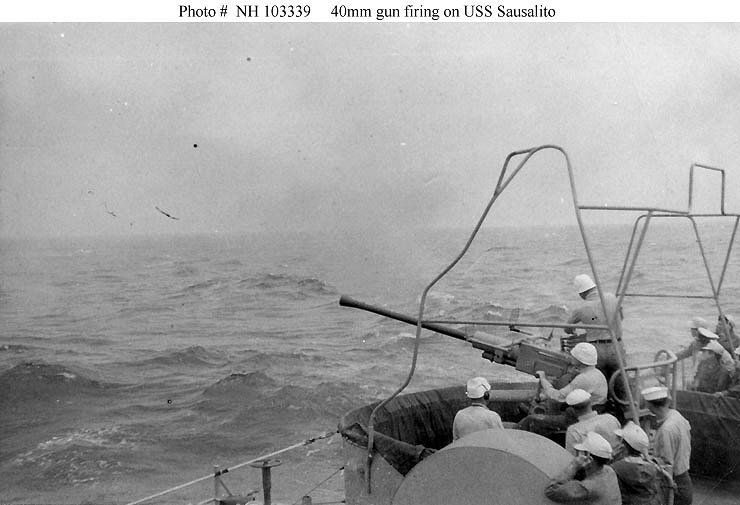 Ship's starboard 40mm gun mount firing, during training operations in the Far East, circa 1951-1952. Photographed by James Edward Taylor, who was then a member of Sausalito's crew Collection of James Edward Taylor Courtesy of his wife, Mary A. Taylor, 2005 Naval History and Heritage Command photo NH 103349-KN |