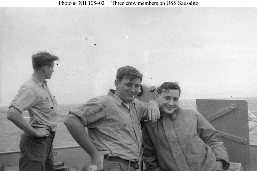 Three crew members in one of the ship's 20mm gun tubs, circa 1952. These men are identified on the original print as Harbor, Sauber and Ramsey. Photographed by James Edward Taylor, who was then a member of Sausalito's crew Collection of James Edward Taylor Courtesy of his wife, Mary A. Taylor, 2007 Naval History and Heritage Command photo NH 105402 |