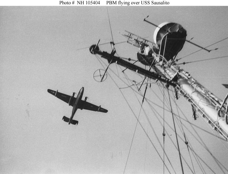 A PBM Mariner patrol plane flies above the ship's mast, during operations in the Japan-Korea area, circa 1952. Photographed by James Edward Taylor, who was then a member of Sausalito's crew Collection of James Edward Taylor Courtesy of his wife, Mary A. Taylor, 2007 Naval History and Heritage Command photo NH 105404 |