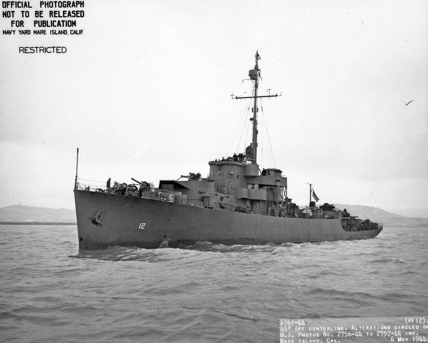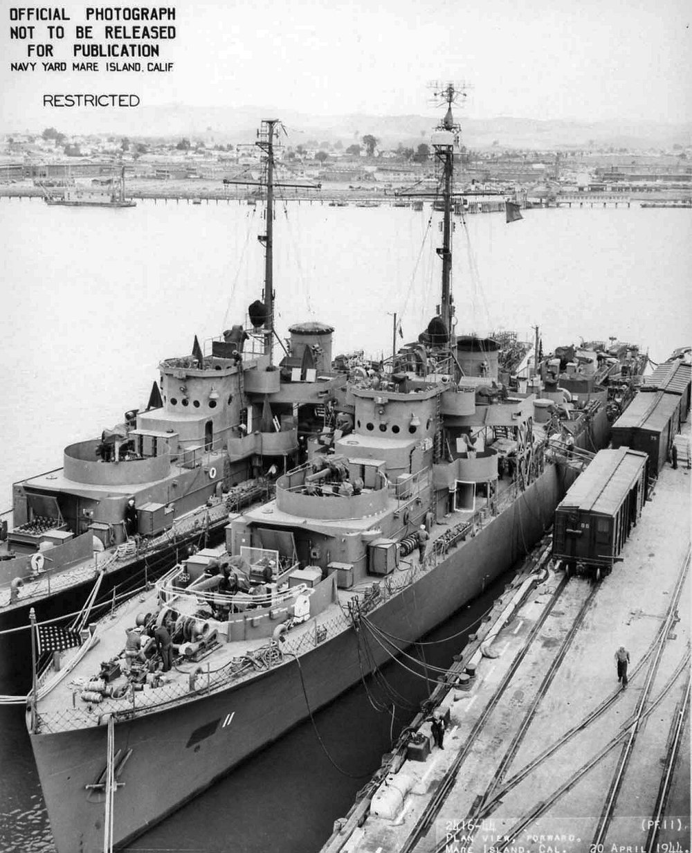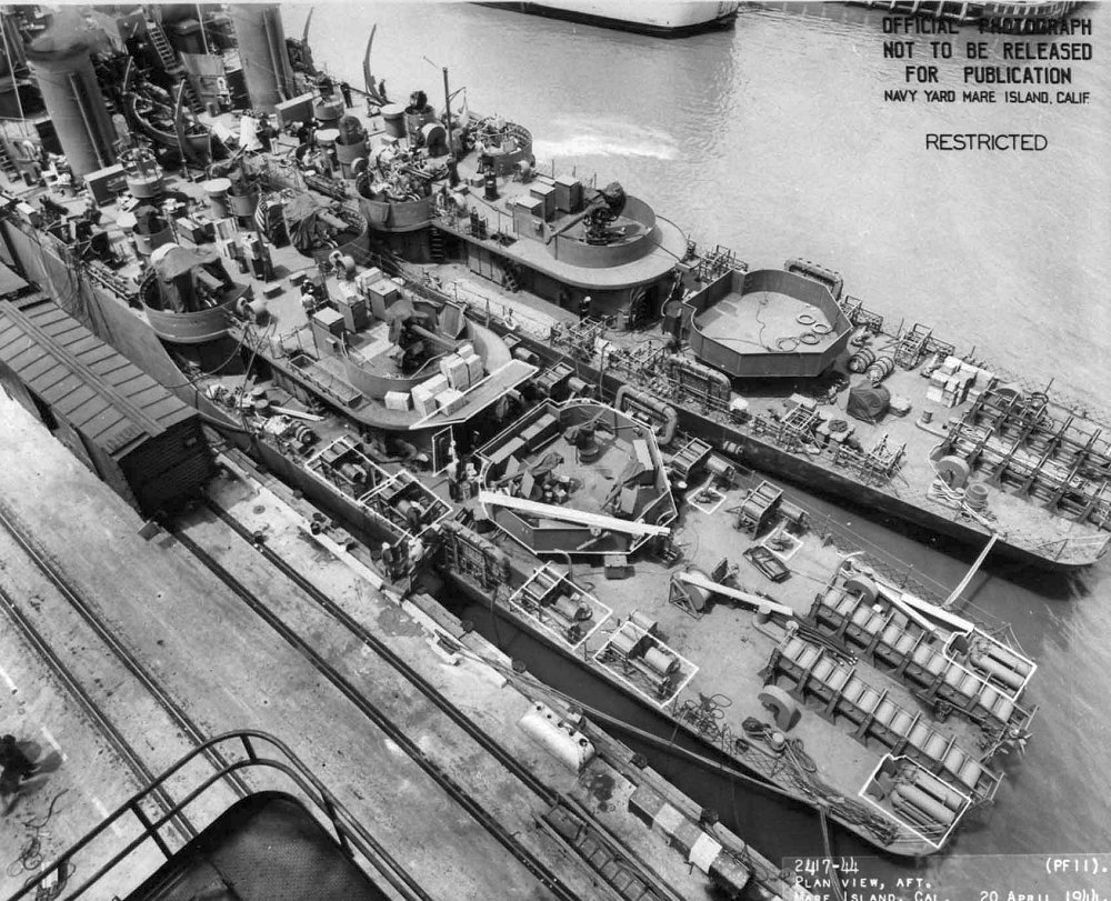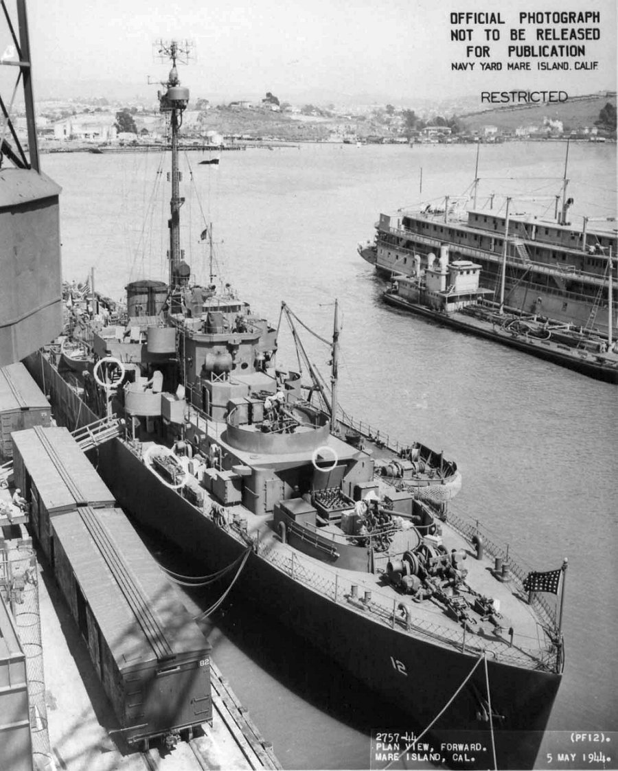 Aft plan view of Grand Forks (PF 11) at Mare Island near the completion of outfitting on 20 April 1944. The Casper is outboard of Grand Forks U.S. Navy Photo 2416-44