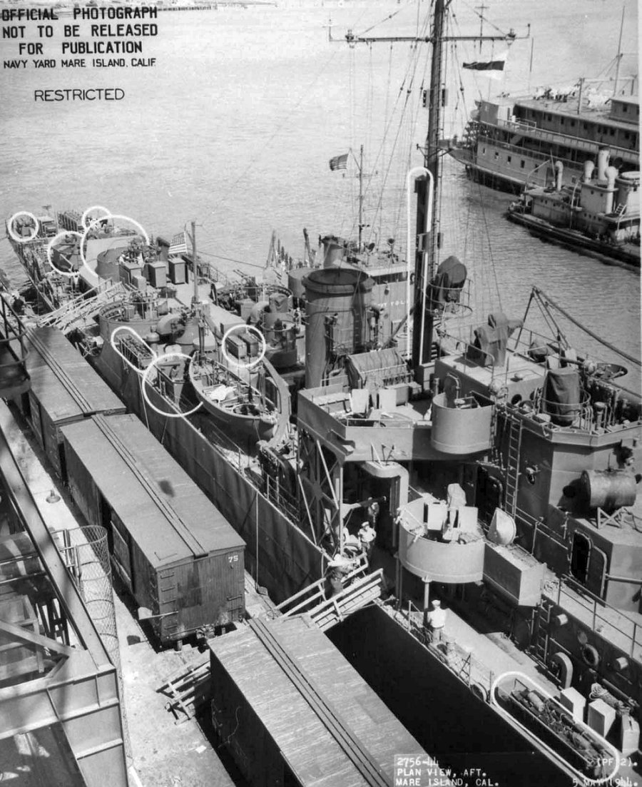 Forward plan view of Casper at Mare Island on 5 May 1944 U.S. Navy photo 2757-44