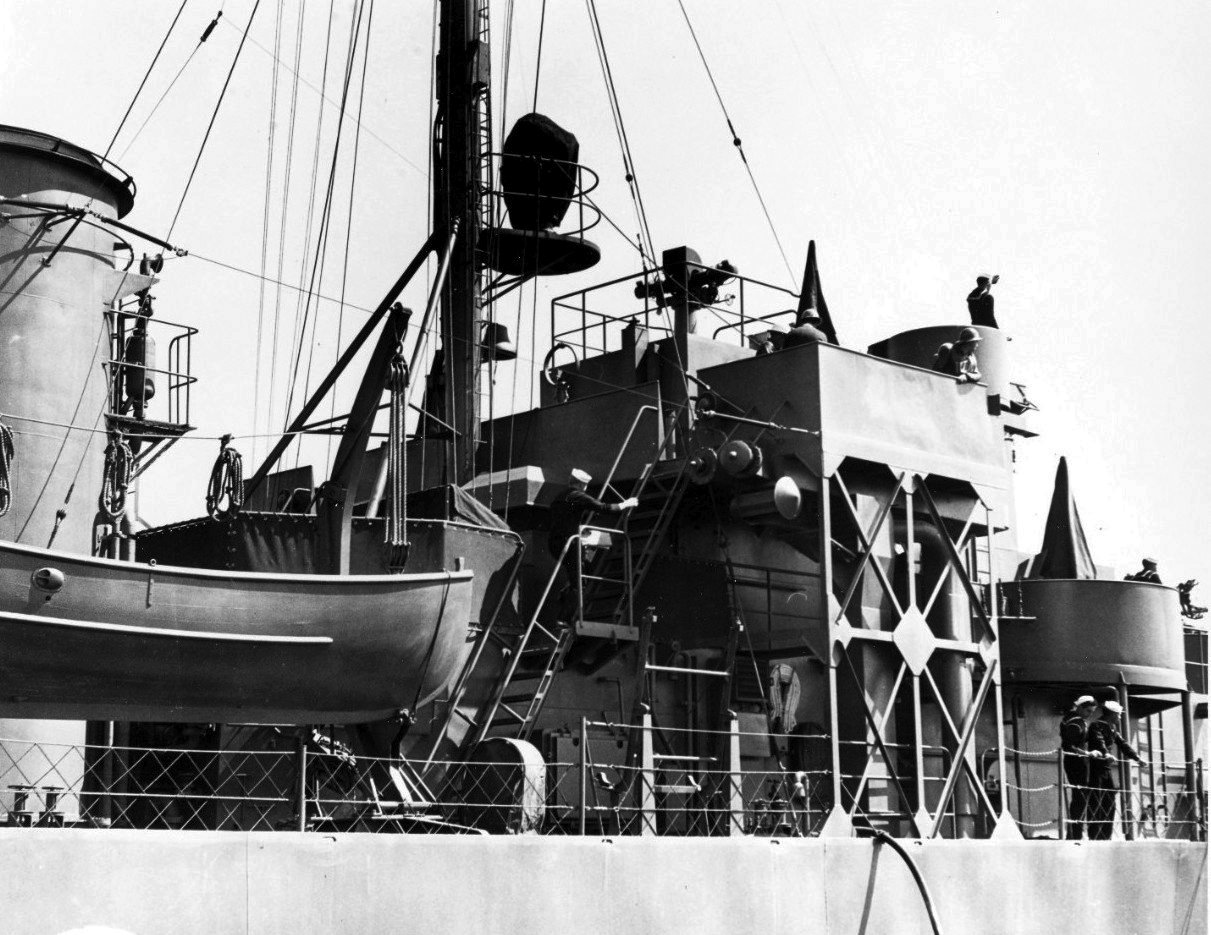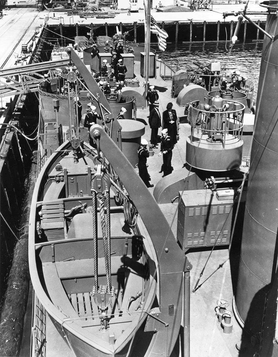 Showing view on board looking aft from the bridge wing along the starboard side, circa early 1944 Naval History and Heritage Command photo NH 93002 |