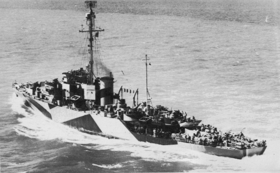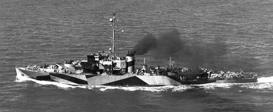Underway near the Norfolk Navy Yard, 9 August 1944. Note the high-frequency direction-finder ("huff-duff") antenna atop the light pole mast, aft, and air-search radar at the top of the foremast. The ship is painted in Measure 32/16D camouflage, the colors of which are dull black, ocean grey and light grey National Archives photo 19-N-72013 from the Dictionary of American Naval Fighting Ships |