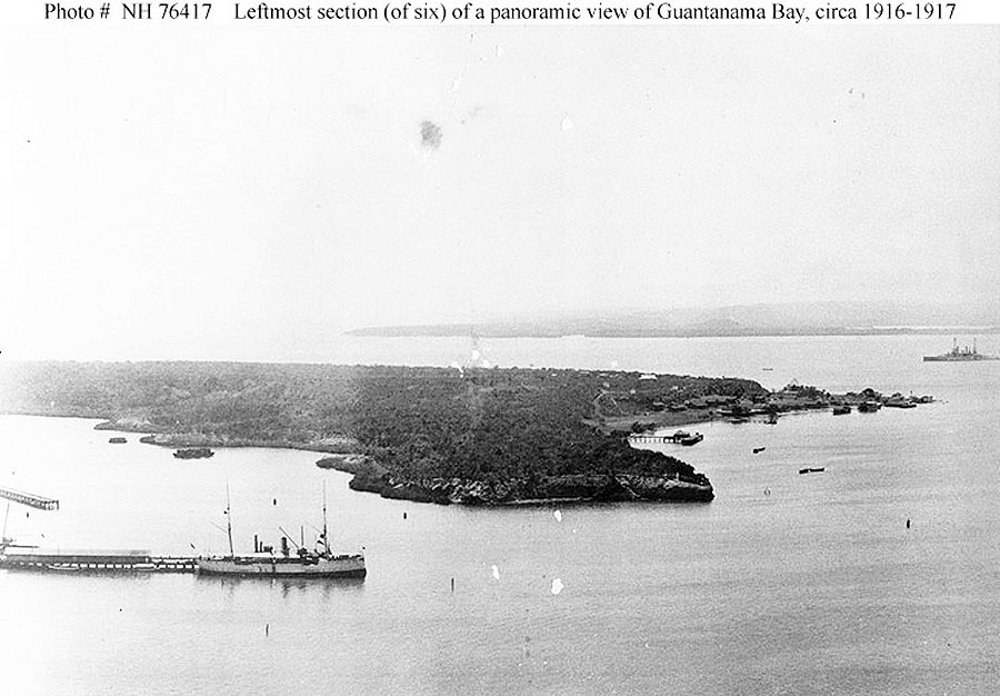 c. 1917/1918 Guantanamo Bay, Cuba Leftmost section (of six) of a panoramic photograph taken from the Naval Station radio tower. Ship at the dock is Petrel, which was then the Station Ship. A South Carolina class battleship is visible in the right distance. Courtesy of the Naval Historical Foundation, Washington, D.C. Donation of MMC Jesse Forton, USN (Retired), 1972 Naval Historical Center photo NH 76417 |