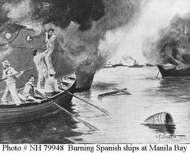 Halftone reproduction of an artwork by E.T. Smith, 1901, depicting a boat party from USS Petrel setting fire to Spanish gunboats near the battle's end. The party was under the direction of Chief Carpenter's Mate Franz A. Itrich, who was awarded the Medal of Honor for this operation Copied from Deeds of Valor, Vol.II, page 354, published by the Perrien-Keydel Co., Detroit, Michigan, 1907 Naval Historical Center photo NH 79948 |