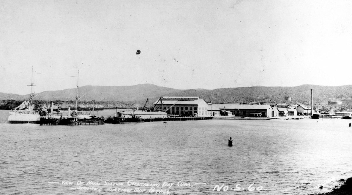 c. 1916/1917 Guantanamo Bay, Cuba View of the "new Naval Station" buildings and wharf, looking south-east. Station ship Petrel is at left. In left center is Water Barge No. 14 (YW-14) Photo by Tolderlund. Courtesy of Carter Rila, 1986 Naval History and Heritage Command photo NH 100937 |