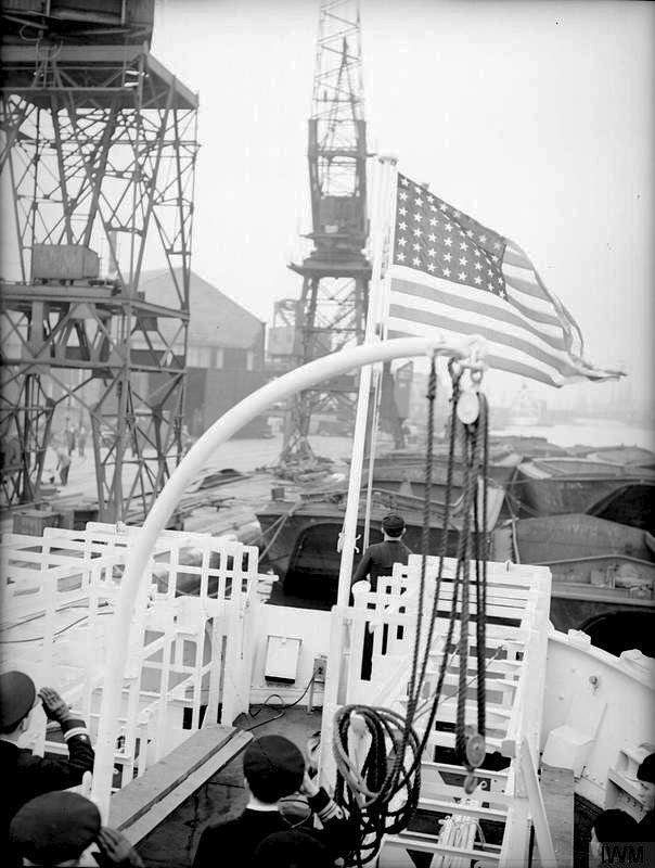 The crew saluting the stars and stripes during the commissioning ceremony aboard the USS Impulse (PG-68) on March 16, 1942 at Albert Docks Imperial War Museum Admiralty Official Collection, by Smith, J.H. (Lt), Photo No. © IWM (A 7789)c. January 1970 |