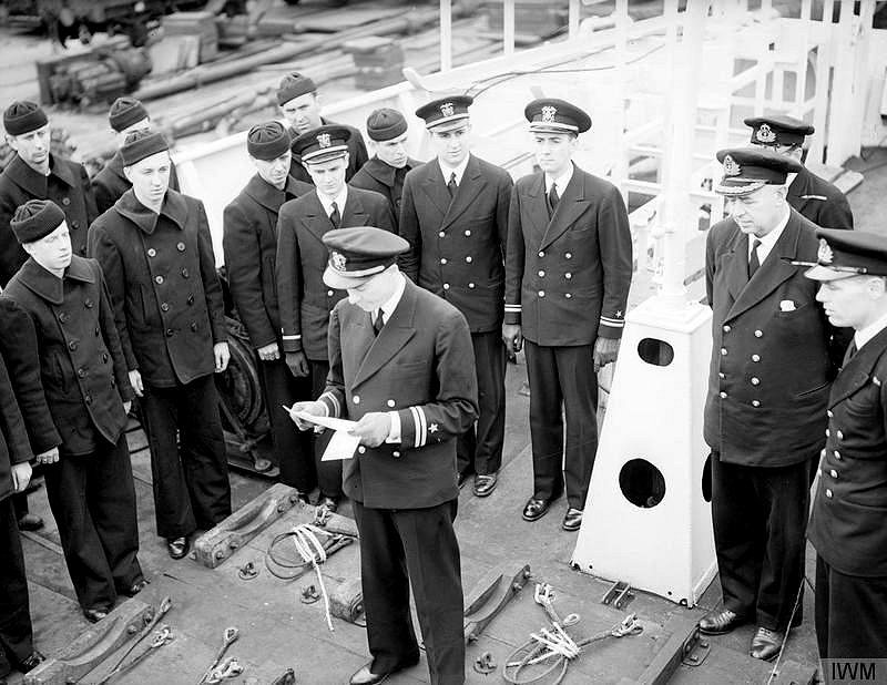 The commissioning ceremonies complete, the captain of the USS Impulse (PG-68) addresses the ship's crew on March 16, 1942 at Albert Docks Imperial War Museum Admiralty Official Collection, by Smith, J.H. (Lt), Photo No. © IWM (A 7788) |