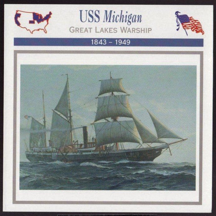 Original photo: Port broadside view of the gunboat Michigan sometime between between 1890 and 1901 Detroit Photographic Co. photo 07358 from the Library of Congress (Photo LC-D-4-7358) Replacement photo: Library of Congress photo |