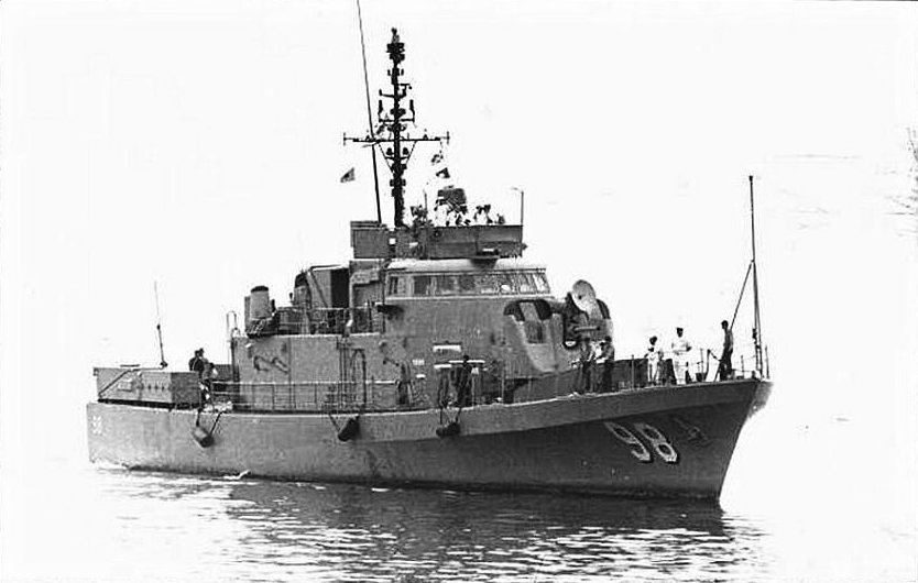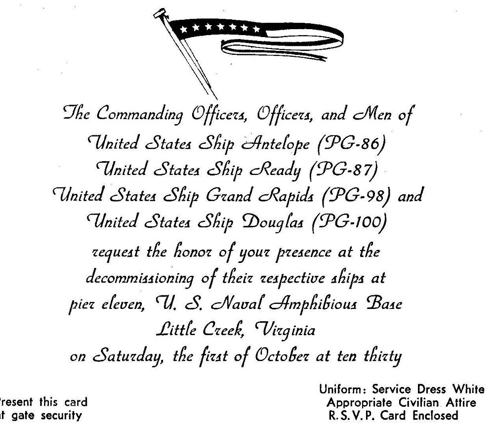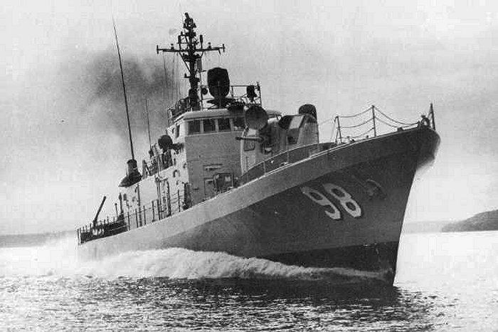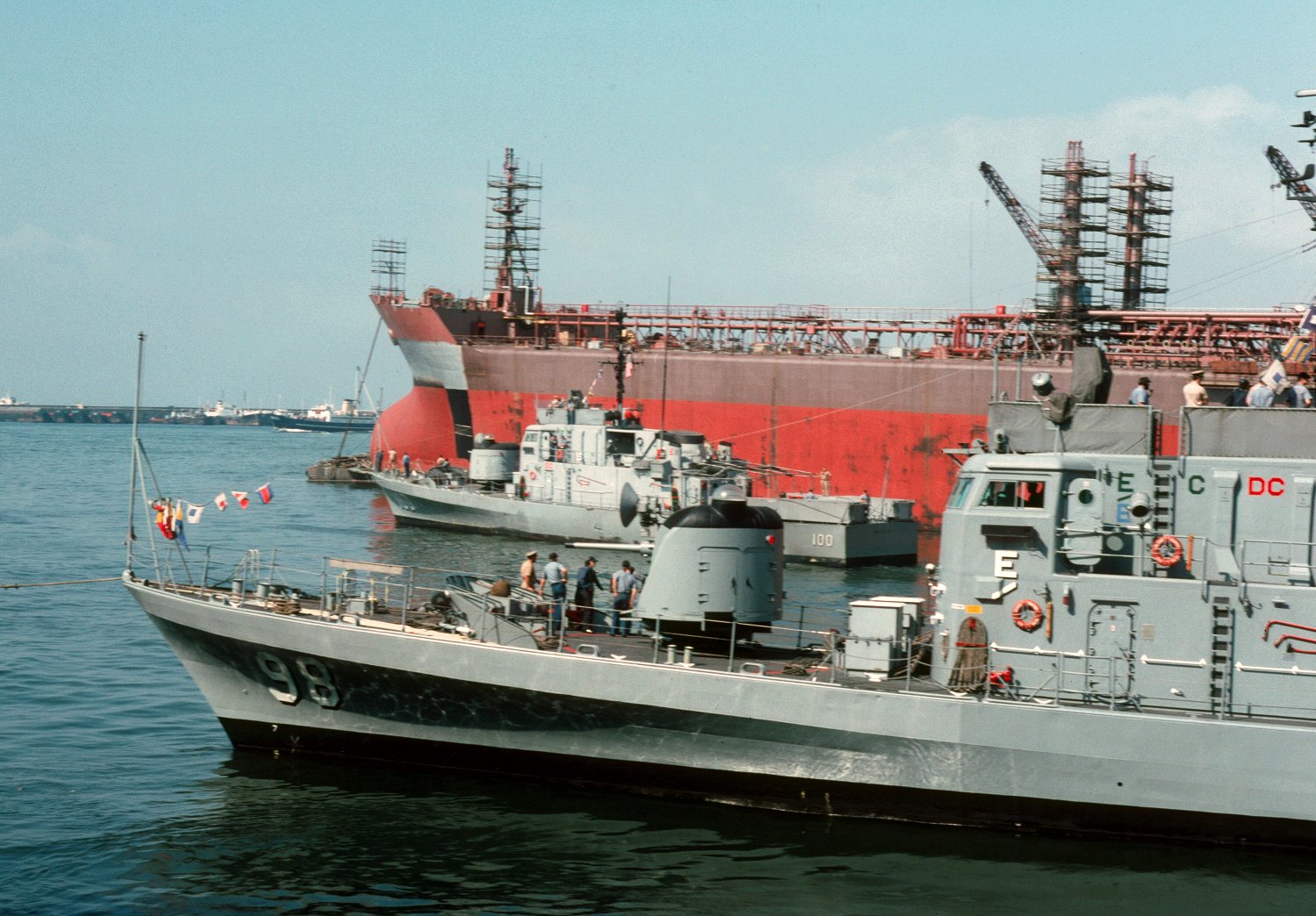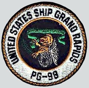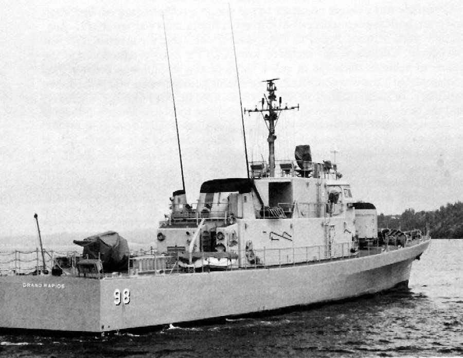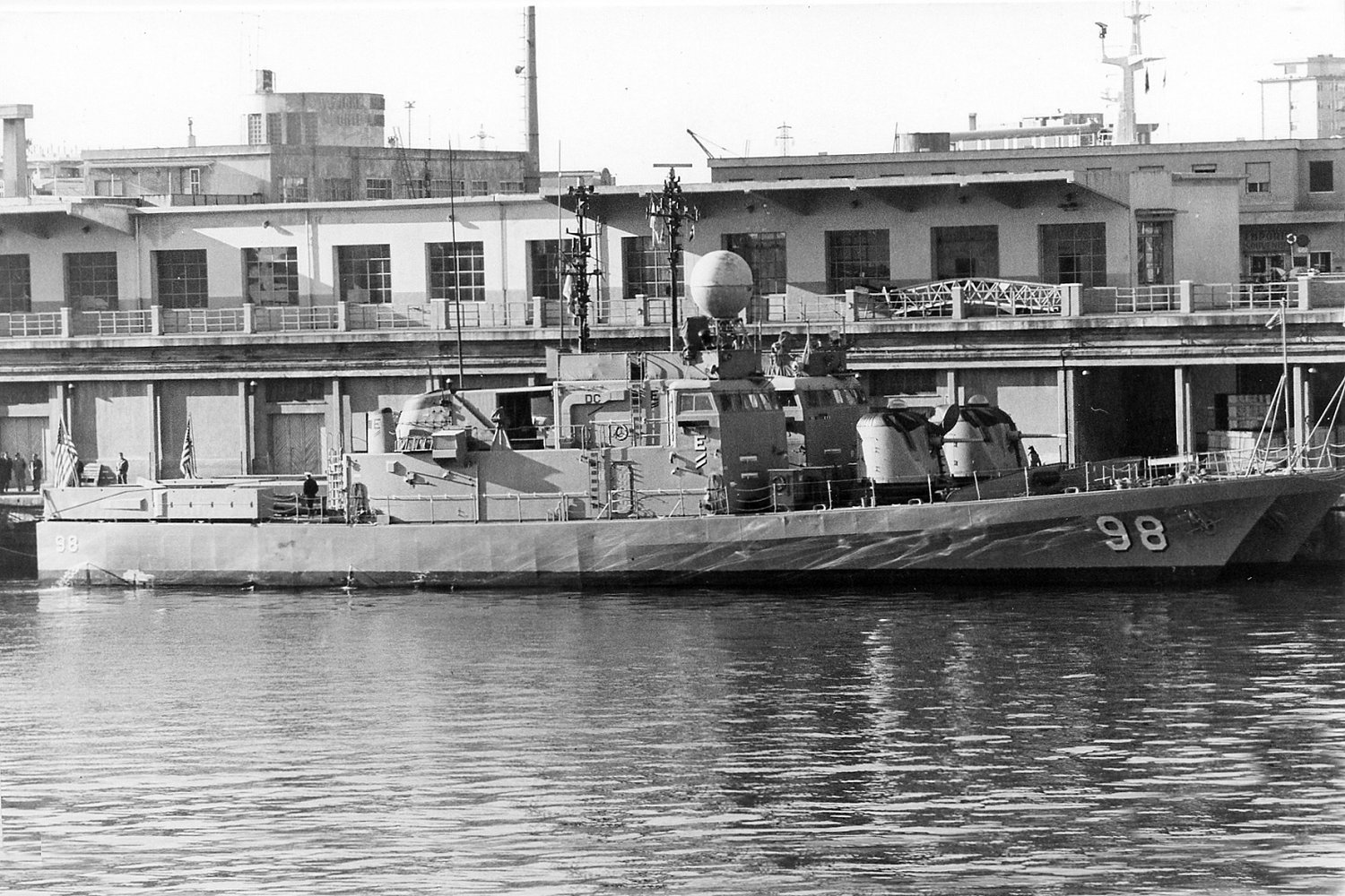 Barcelona, Spain 6 December 1976. Ready (PG 87) in foreground, inboard with Grand Rapids outboard. Background inboard is Douglas (PG 100) with Antelope (PG 86) inboard. Antelope and Ready are fitted with Mk-87 fire control systems, with antenna inside domes, whereas Grand Rapids and Douglas have a Mk-63 fire control system, with an SAG-50 radar antenna on the gun mounts. |