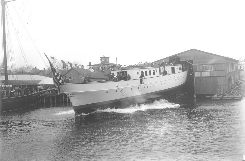 Dressed with flags while at anchor, circa 1919. Note the three men with signal flags beside, atop and in front of the pilot house, spelling out (respectively) R; K and Y Donation of Dr. Mark Kulikowski, 2008 U.S. Navy photo NH 105704 |