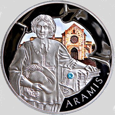 Namesake: René d'Herblay, alias Aramis, is a fictional character in the novels The Three Musketeers (1844), Twenty Years After (1845), and The Vicomte de Bragelonne (1847-1850) by Alexandre Dumas, père. He and the other two musketeers, Athos and Porthos, are friends of the novels' protagonist, d'Artagnan. The fictional Aramis is loosely based on the historical musketeer Henri d'Aramit Photo from the Belarus and the global community. Commemorative coins "Aramis" |