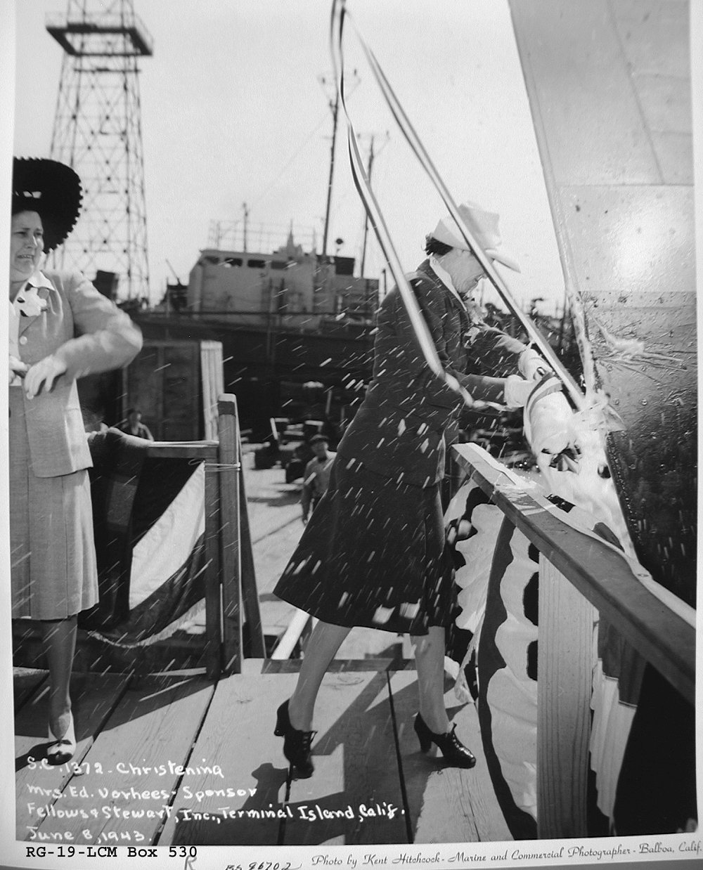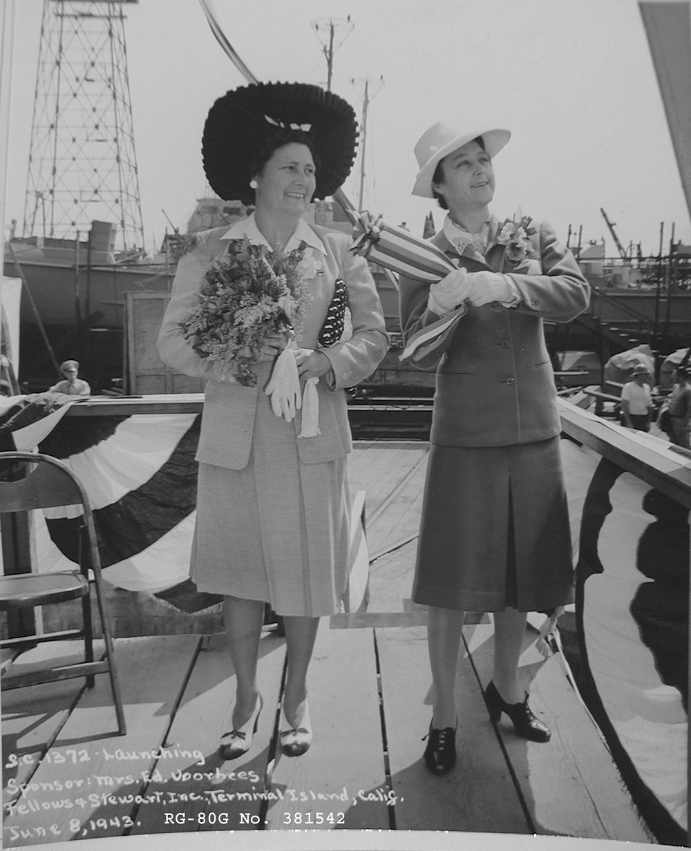 8 June 1943 Fellows and Stewart, Inc., Terminal Island, CA Mrs. Edward Vorhees, Ships Sponsor, christening the ship Photo by Kent Hitchcock, Marine and Commercial Photographer, Balboa, CA National Archives photo |