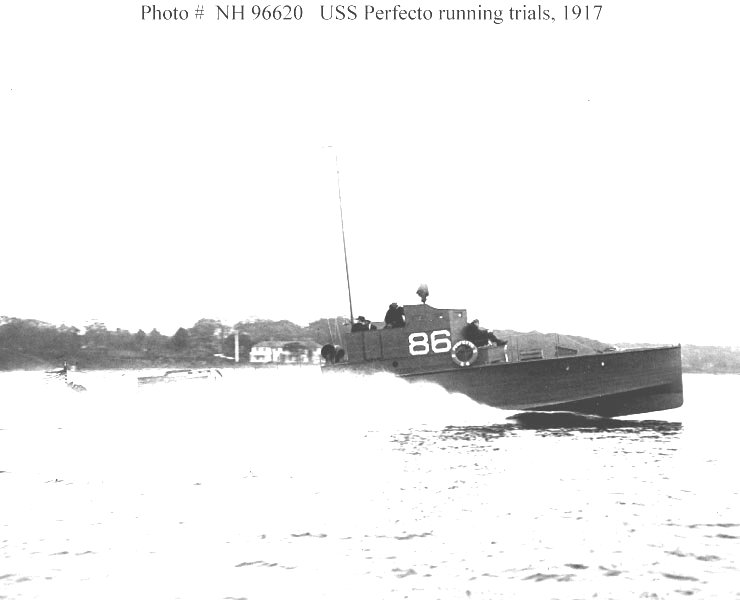 Dictionary of American Naval Fighting Ships History: Perfecto (SP-86) was built in 1917 by Greenpoint Basin and Construction Co., Greenpoint, L.I.; leased by the Navy from J.J. Phelps, Hackensack, N.J. 22 June 1917; and placed in service 25 June 1917.During World War I, Perfecto operated in the 5th Naval District, headquartered at Norfolk. She patrolled along the Atlantic coast and kept watch against the U-boat threat. After war-time service and decommissioning, the motorboat was returned to her owner 18 February 1919.