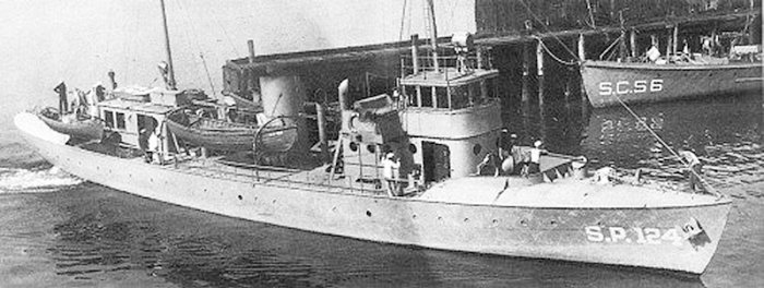 SC-64 underway in a New York area harbor, 1918. Ships in the immediate background are (from left to right): USS Bailey (Torpedo Boat No. 21); Tarantula; USS Sabalo (SP-225); A Bagley class torpedo boat; and USS SC-55. U.S. Navy photo NH 59816 |