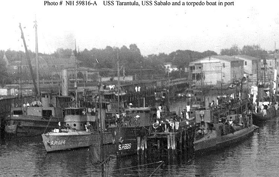 Tarantula, in left center, and USS Sabalo (SP-225), in center. Docked in a New York area harbor, 1918. A Bagley class torpedo boat is also present, at right. This image is cropped from the Naval History and Heritage Command photo NH 59816 Naval History and Heritage Command photo NH 59816-A |