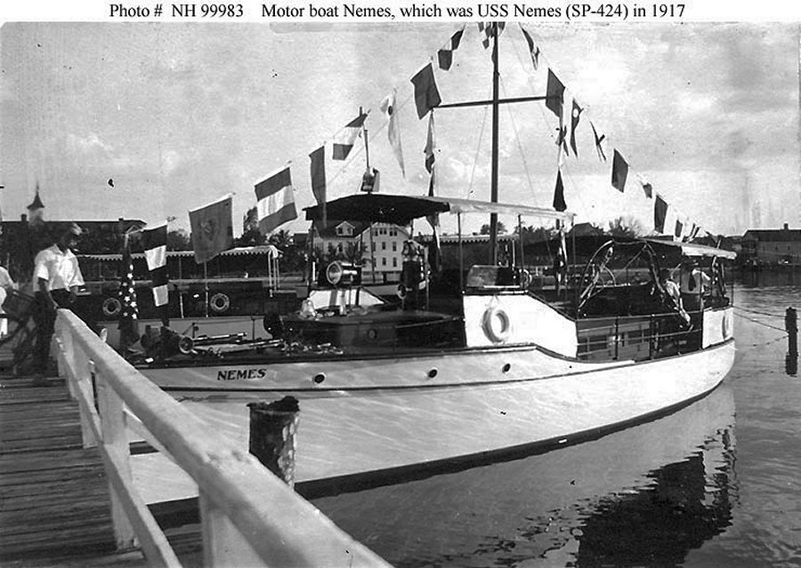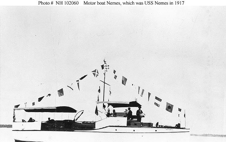 Dictionary of American Naval Fighting Ships History: Nemes, a motor boat built in 1909 by Van Deise, Camden, N.J., was acquired by the Navy from J. C. Noblit, Germantown, Pa., 10 July 1917; and placed in service shortly thereafter, Boatswain W. H. Noblit in command.Operating in the 7th Naval District, headquartered at Key West during World War I, Nemes met with ill fate soon after beginning her service. Scheduled to patrol around Key West, she pulled into Cotteral Bay for cleaning in August; while there, an explosion rocked the ship 21 August 1917 causing her to burn and sink.