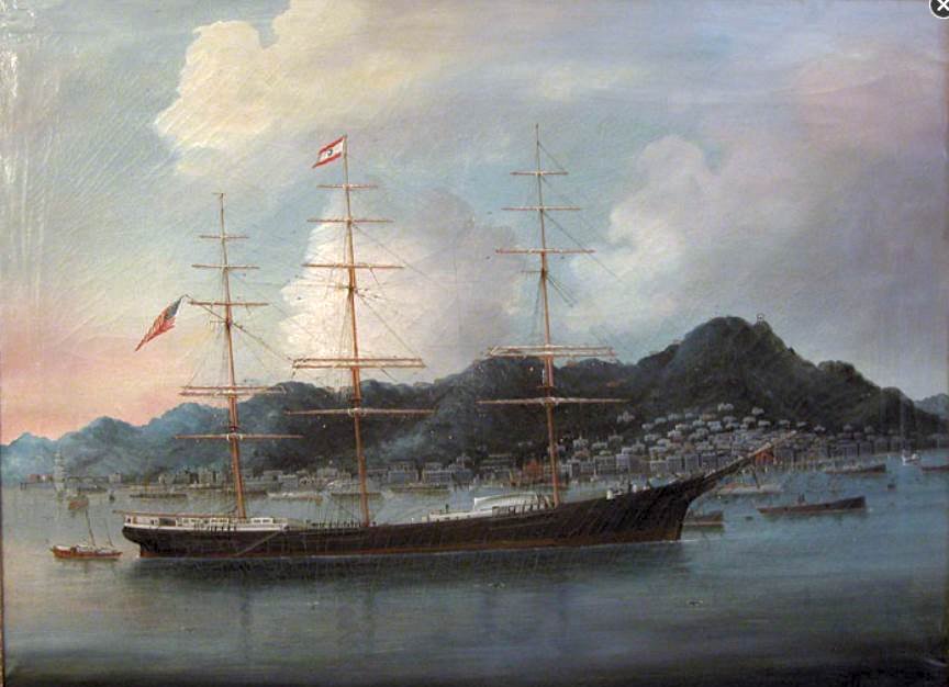 Under the command of Capt Daniel C. Nichols of Searsport, Maine in Hong Kong, near the end of her sailing life. The painting originally had one mast placed incorrectly. The captain had the artist correct it, but the reflection in the water was not painted out. The picture shows four reflections for three masts. She was launched by John McDonald in Bath, Maine in 1879. Her rig was so tall that she needed her royal masts, at the very tops of the rig, to be strikeable so that she could get under the Brooklyn Bridge. She frequently made the New York to San Francisco run. Captain Nichols commanded the vessel for only five years, retiring when she was sold to the Luckenbach company as a barge in 1905 |