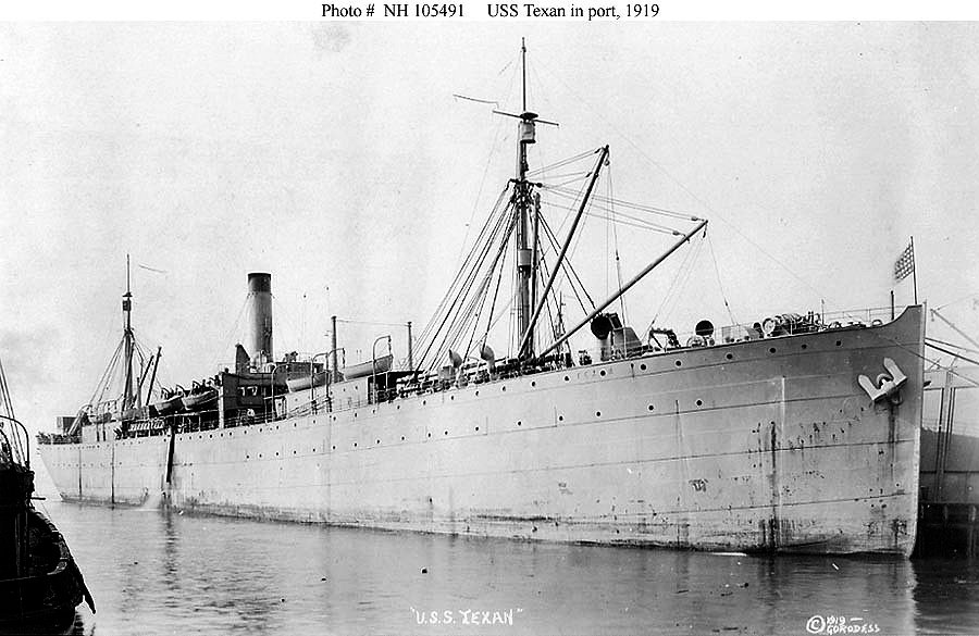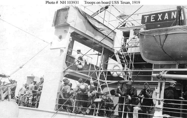 Troops and sailors on deck amidships, while she was employed bringing servicemen home from Europe, 1919. The original image was printed on postal card ("AZO") stock Donation of Dr. Mark Kulikowski, 2006. Naval History and Heritage Command photo NH 103931 |