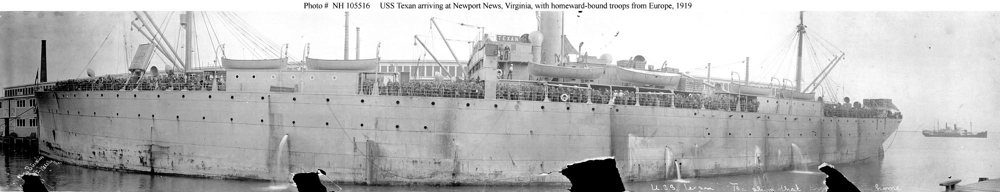 Arriving at Newport News, Virginia, with troops brought home from France, 1919. The tug Britannia is at left. Donation of Dr. Mark Kulikowski, 2006 Naval Historical Center photo NH 104077 |