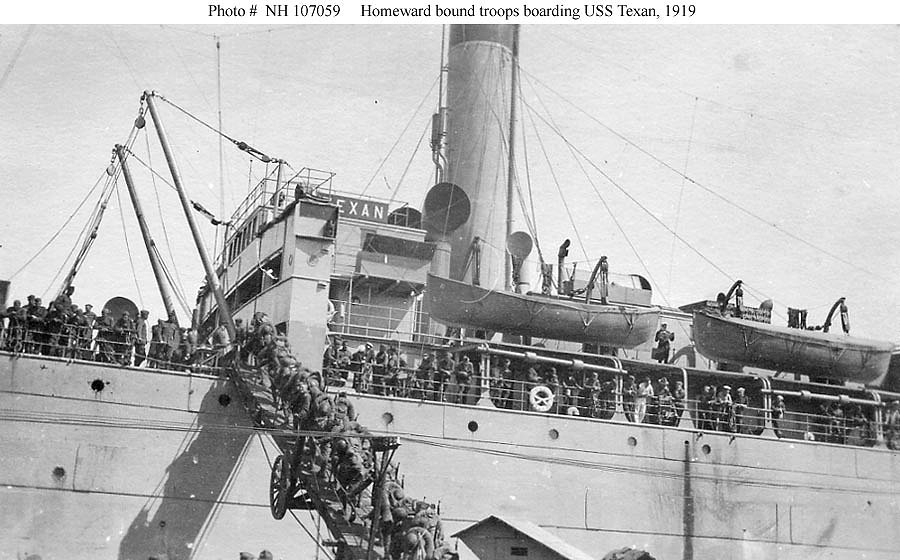 Homeward-bound troops boarding the ship at St. Nazaire, France, 1919. The original image is printed on post card ("AZO") stock Donation of Dr. Mark Kulikowski, 2010. Naval History and Heritage Command photo NH 107059 |