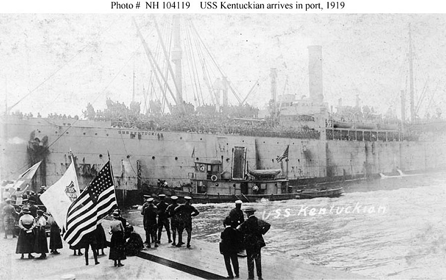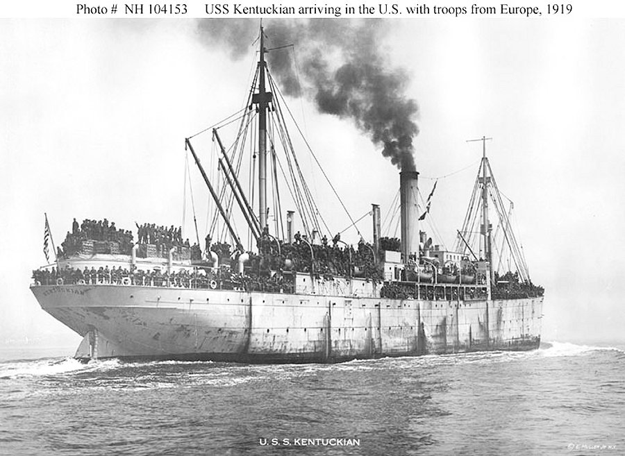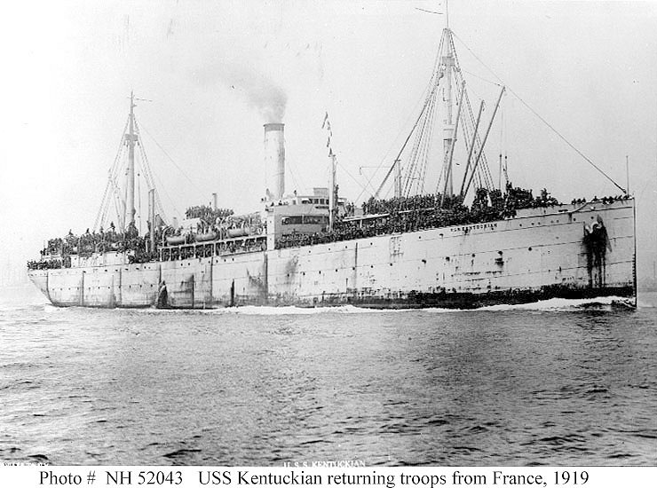 Kentuckian was assigned to transport duty as thousands of American World War I veterans were awaiting return to the United States. She cleared New York on her first cruise 2 March 1919 picked up nearly 2,000 troops at St. Nazaire, France, and returned New York 1 April. The transport made a total of five cruises from New York to France, unloading general cargo at France and returning with troops. Kentuckian arrived Norfolk 31 August from her final cruise, decommissioned 15 September 1919, and returned to her owners the same day.