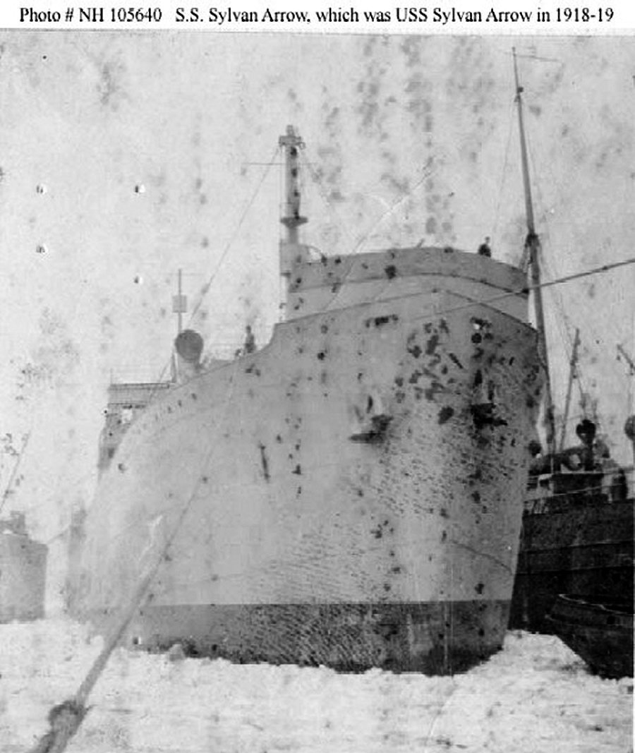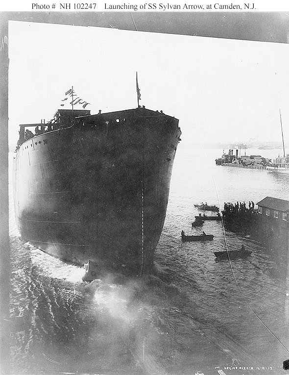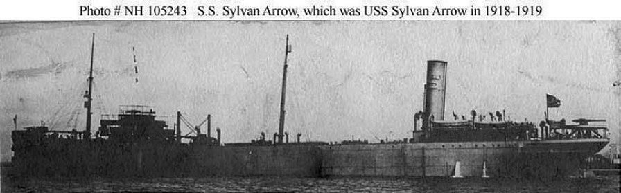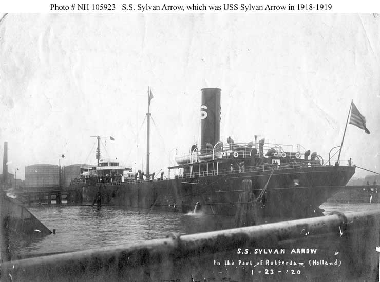 Dictionary of American Naval Fighting Ships: Sylvan Arrow (ID. No. 2150) was built in 1918 by the New York Shipbuilding Corp., Camden, N. J. The ship was owned and operated as tanker by the Standard Oil Co. She arrived at New York on 15 July 1918, was taken over and refitted for naval use, was commissioned on 19 July; and assigned to the Naval Overseas Transportation Service.Sylvan Arrow loaded a cargo of fuel oil and seaplanes at New York and sailed for England on the 28th. She arrived at Devonport on 14 August and began her return voyage on the 17th. She delivered cargo to Brest, France, on 22 September and unloaded another at Sheerness, England, on 11 November.