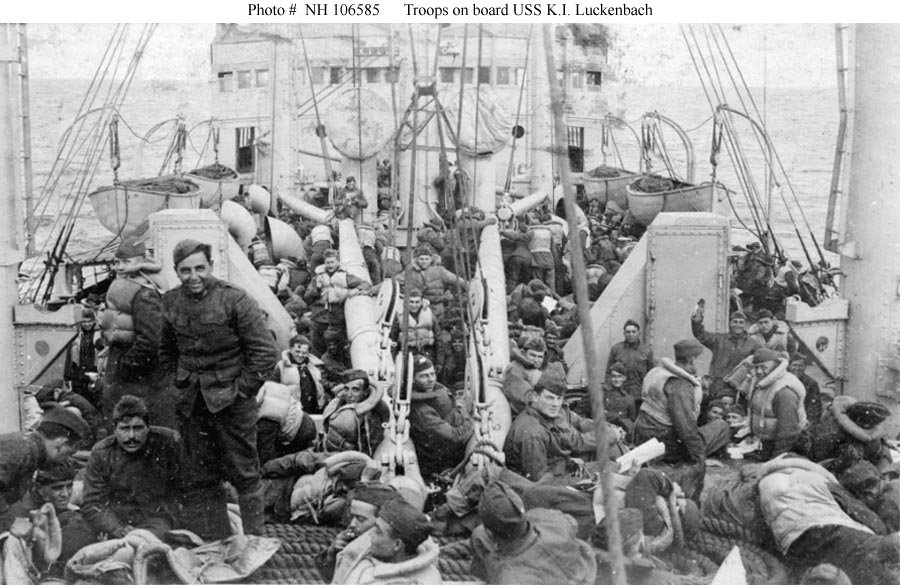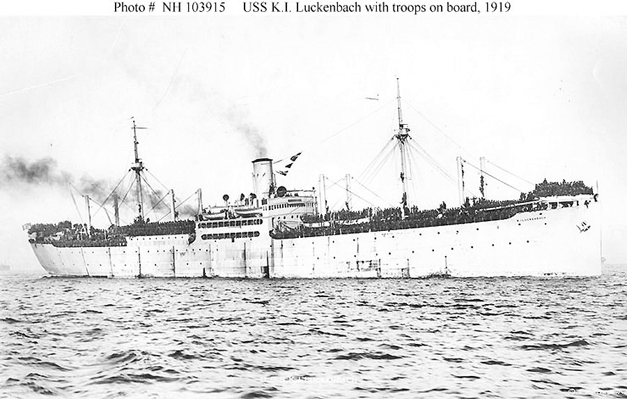 Troops crowd the ship's foredeck, as seen from her bridge during a voyage from France to the United States, 31 April 1919 Donation of Dr. Mark Kulikowski, 2008 Naval History and Heritage Command photo NH 106027 Photo added 17 October 2019 |