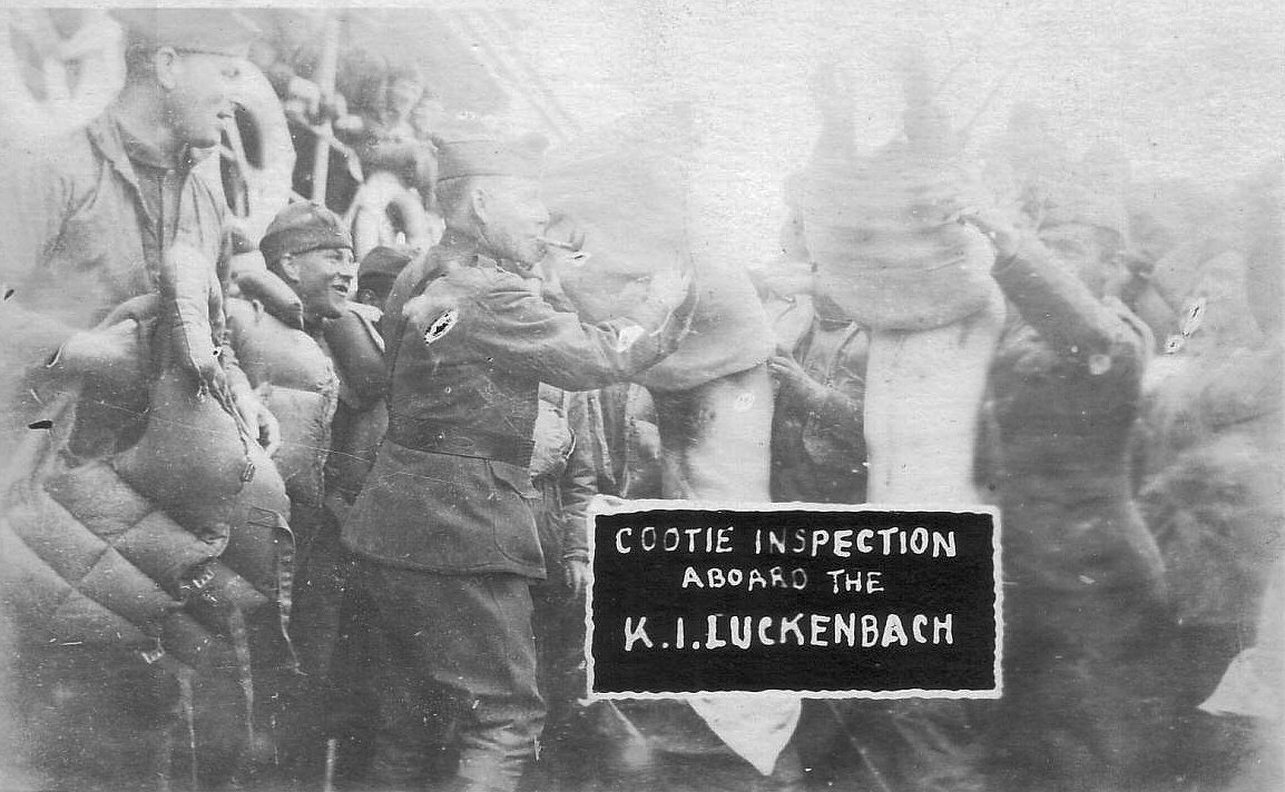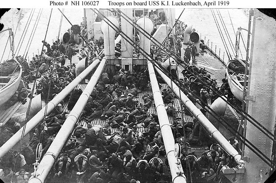 Homeward bound troops relaxing on the ship's foredeck at sea, 12 May 1919 Donation of Dr. Mark Kulikowski, 2009 Naval History and Heritage Command photo NH 106585 Photo added 17 October 2019 |