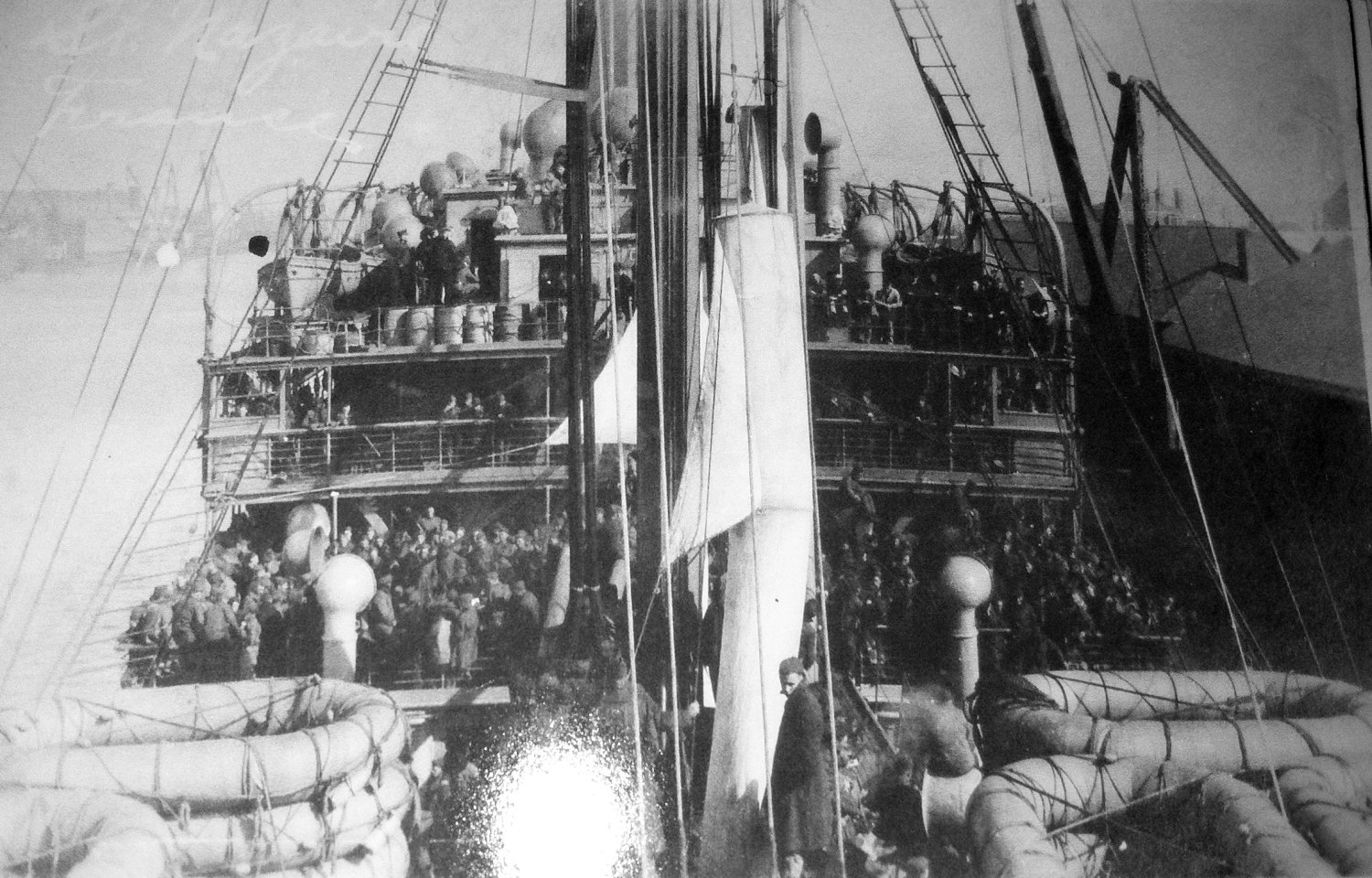 Leaving a French port with homeward bound U.S personnel on board, 1919 Donation of Dr. Mark Kulikowski, 2006 Naval Historical Center photo NH 104235 |