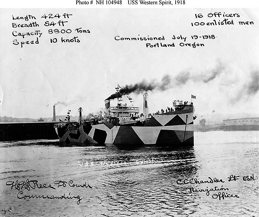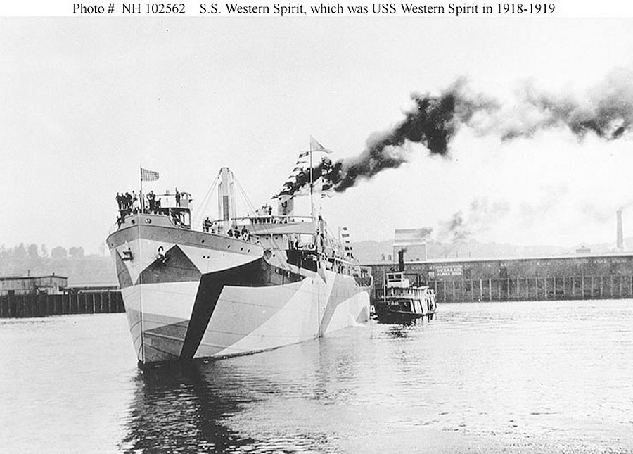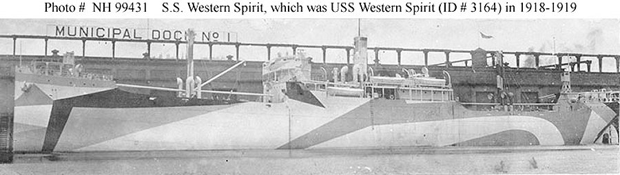 Photographed circa mid-July 1918, probably off the Albini Dock, Portland, Oregon. This photo may show the ship while she was still S.S. Western Spirit, at the time of her construction was completed by the Northwestern Steel Company, of Portland. Donation of Dr. Mark Kulikowski, 2007 Naval Historical Center photo NH 104948 |