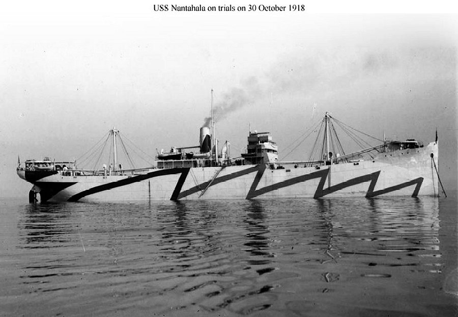 46k | Photographed off San Francisco, California, when first completed, circa summer 1918. She is wearing "dazzle" camouflage and has the tug Sea Fox, of San Francisco, alongside U.S. Navy photo NH 65106 |