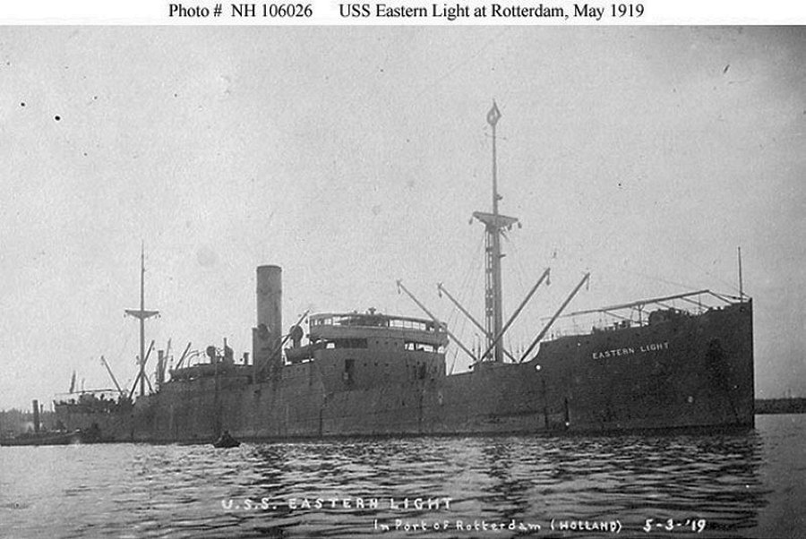 After loading a cargo of flour and other stores at Tacoma, Washington, Eastern Light departed Seattle 29 December 1918 for the east coast, arriving at Norfolk 9 February 1919. She loaded cargo for the Food Administration and sailed for northern Europe, 13 February, via Falmouth, mooring at Rotterdam 5 March. Her cargo was transferred to barges for use by the Relief Commission in alleviating the famine caused by the ravages of war.