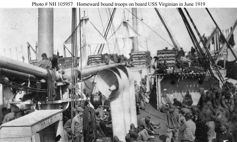 113k | Arriving in a U.S. East Coast port at the end of a voyage bringing troops home from France, circa April-August 1919 Donation of Dr. Mark Kulikowski, 2006 Naval Historical Center photo NH 103925 |