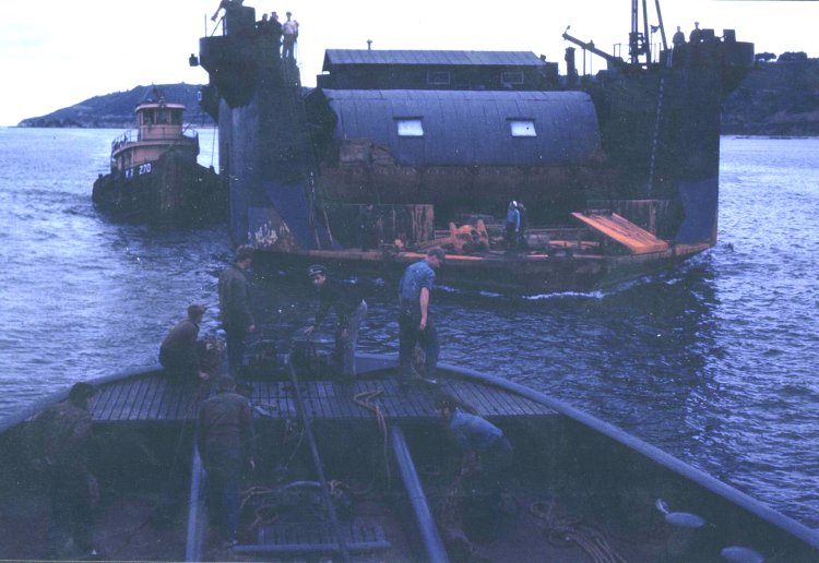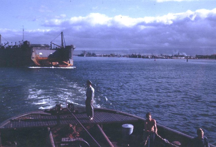 USS ATA-203 departing Pearl Harbor with YFD-15 under tow. |