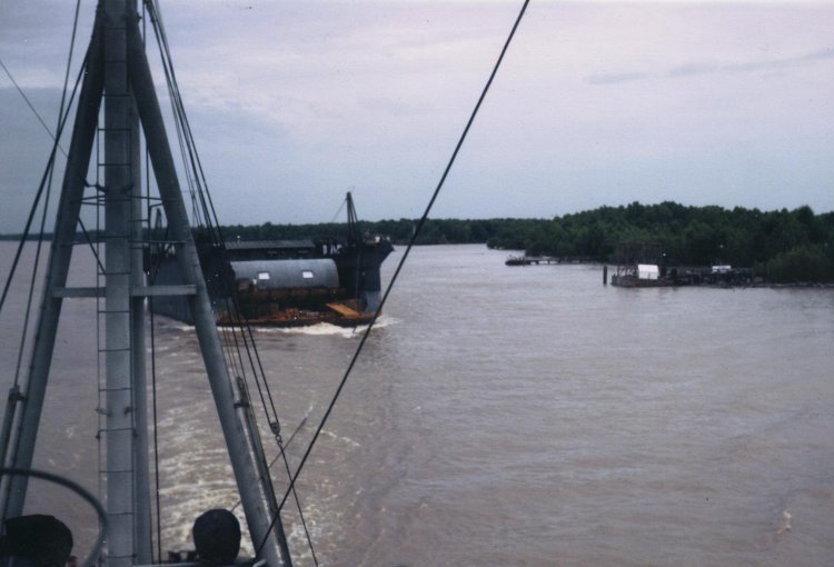 USS ATA-203 on the lower Mississippi River towing YFD-15 to New Orleans. 30 June 1946 |