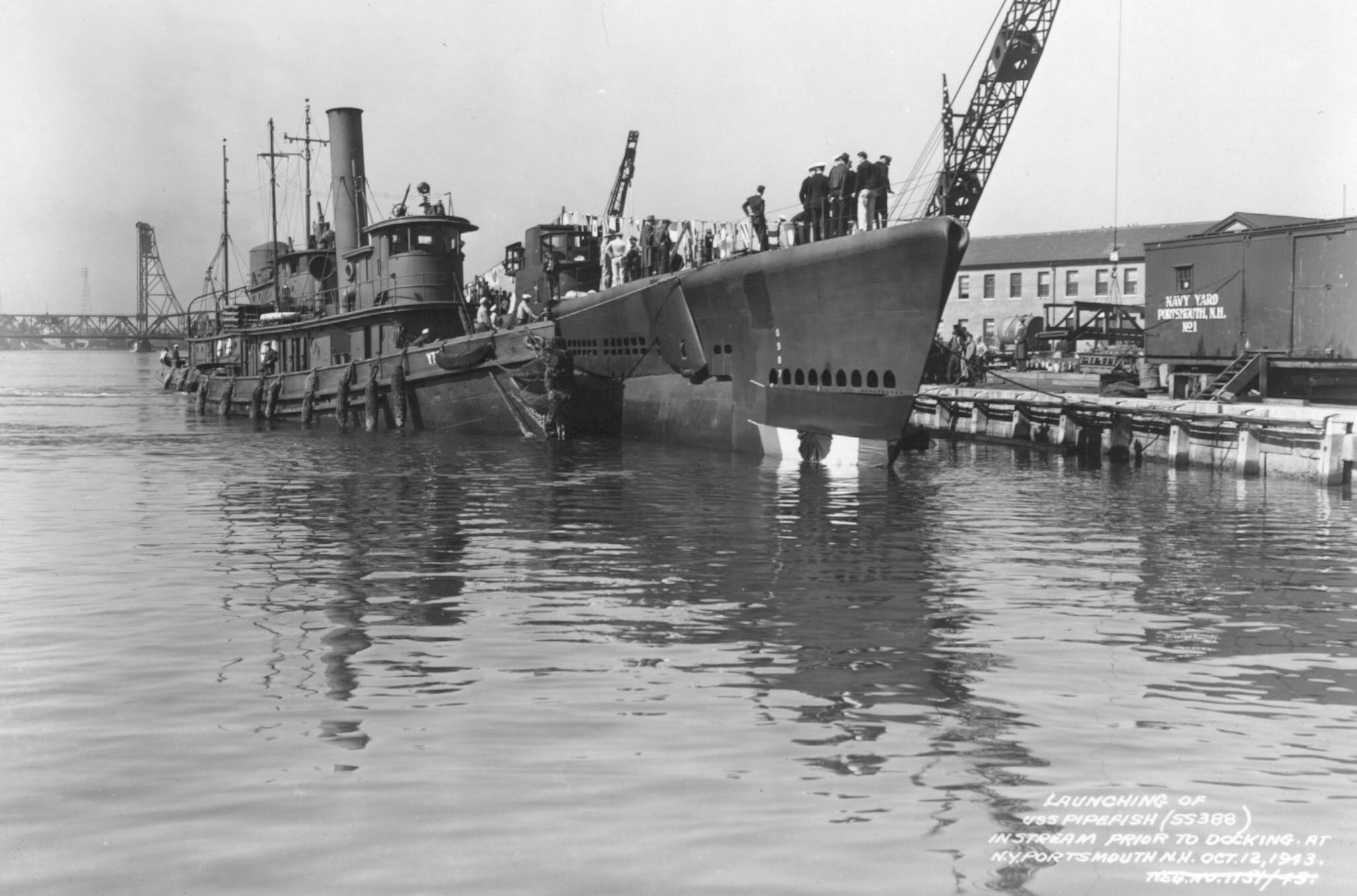 608k | Penacook with another unidentified YT behind, alongside the just launched Pipefish (SS-388) at Portsmouth Navy Yard, 12 October 1943. USN photo courtesy of ussubvetsofwwii.org. |