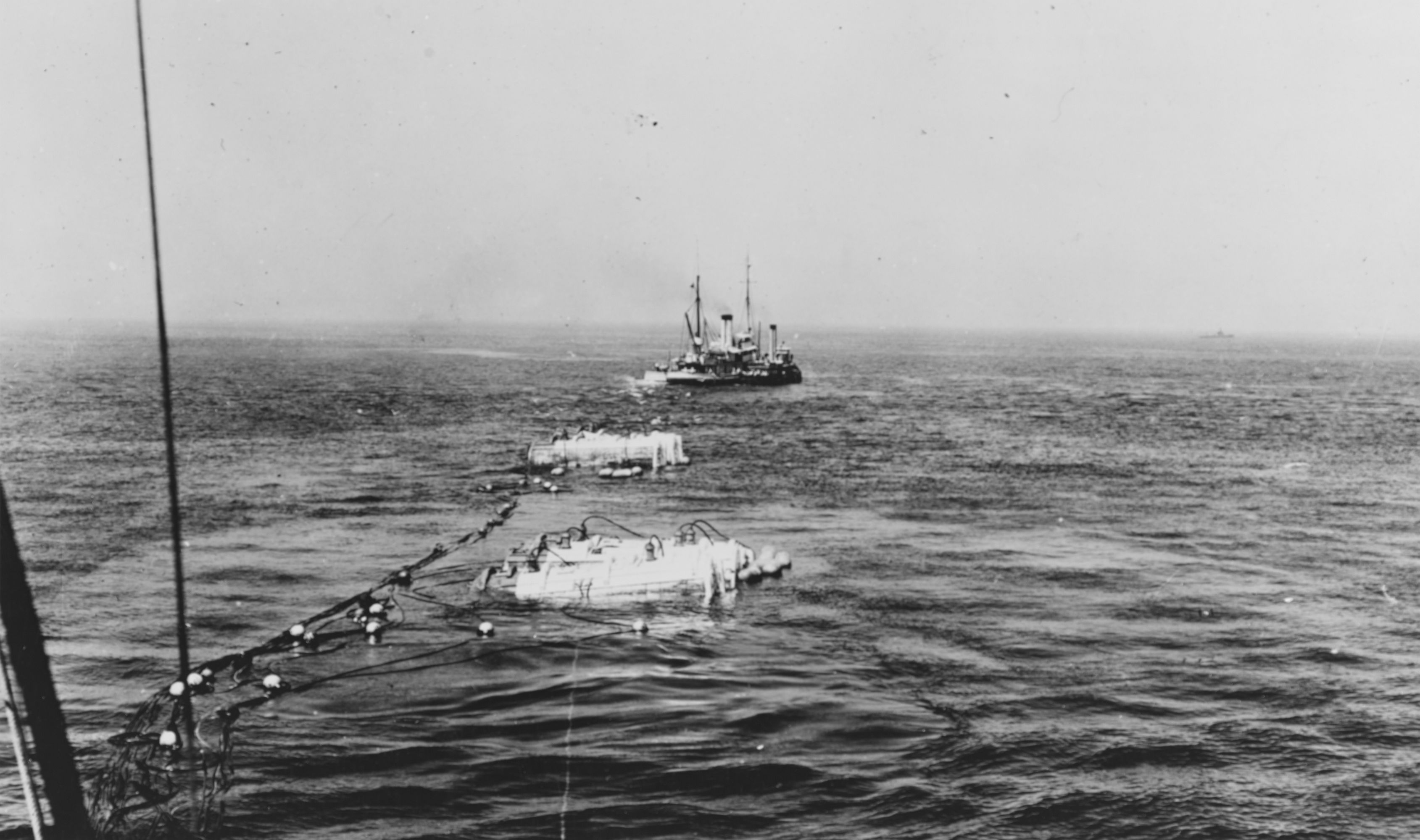 471k | Penacook (YT-6) towing the sunken submarine Squalus (SS-192), 12 August 1939, after Squalus had been lifted off the sea bottom and supported by salvage pontoons. Wandank (AT-26) and Penacook (YT-6) are towing, while Falcon (ASR-2) acted as restraining ship. There are groups of three pontoons each visible on the surface at the submerged submarine's bow and stern. One more pontoon was underwater at the bow and three more at the stern.