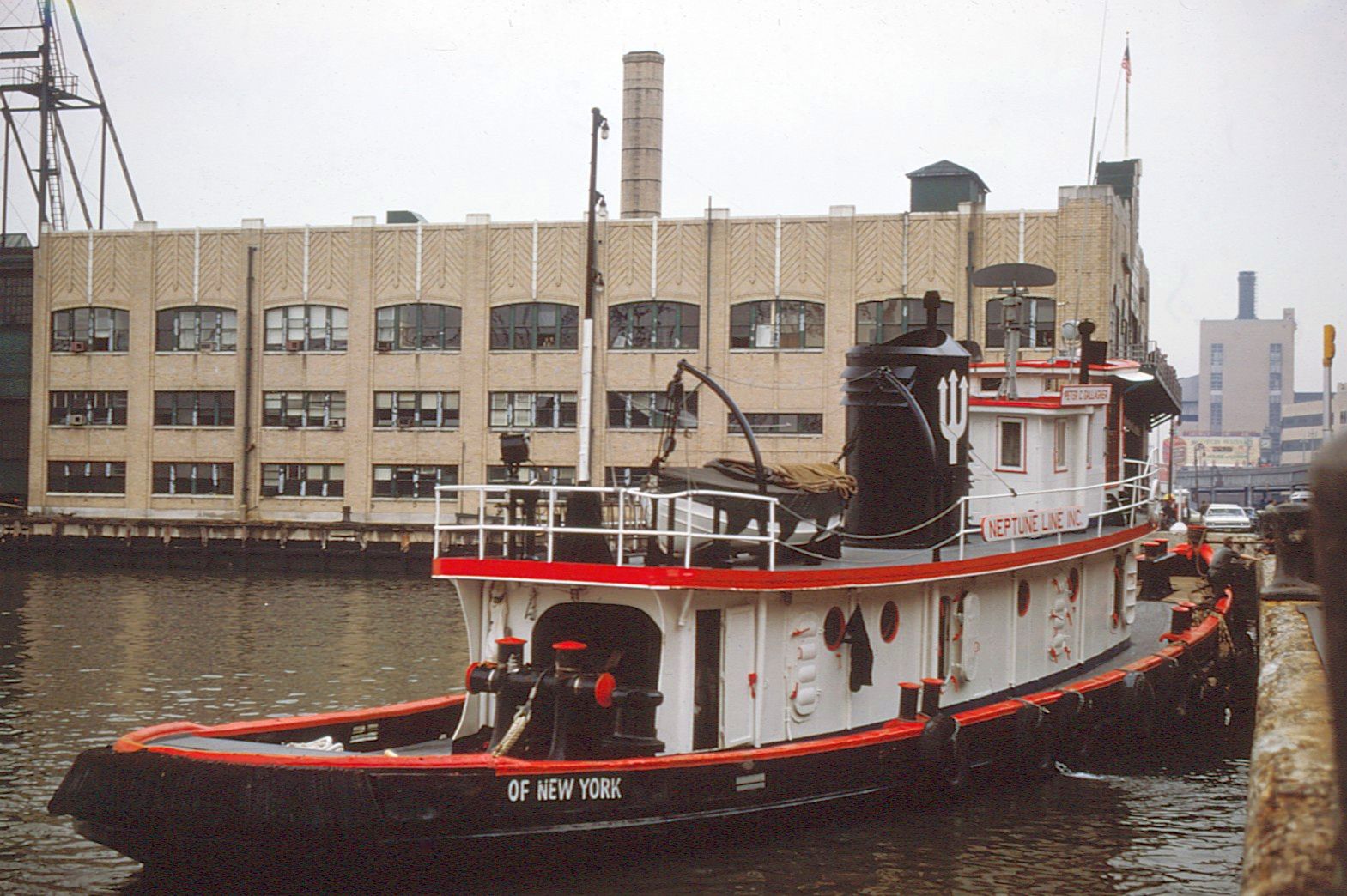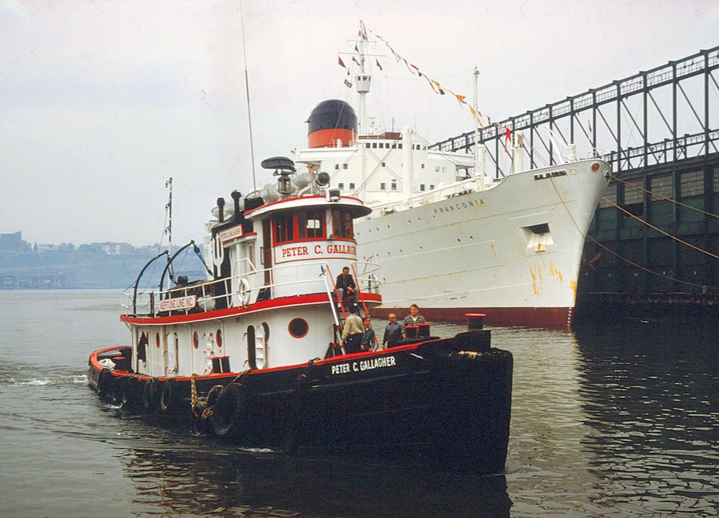 271k | Neptune Line tug Peter C. Gallagher, moored pierside at New York, 27 April 1968. Cunard's Franconia of 1955 is moored in the background. Photographer unknown. | Dave Boone | |