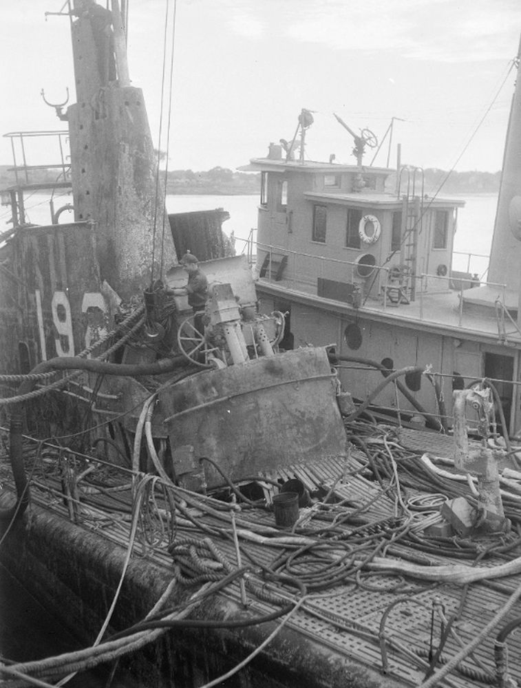 119k | Penacook (YT-6) alongside the salvaged submarine Squalus (SS-192) at Portsmouth Navy Yard, 15 September 1939. Note her pilothouse was raised to increase visibility sometime in the previous twenty years.