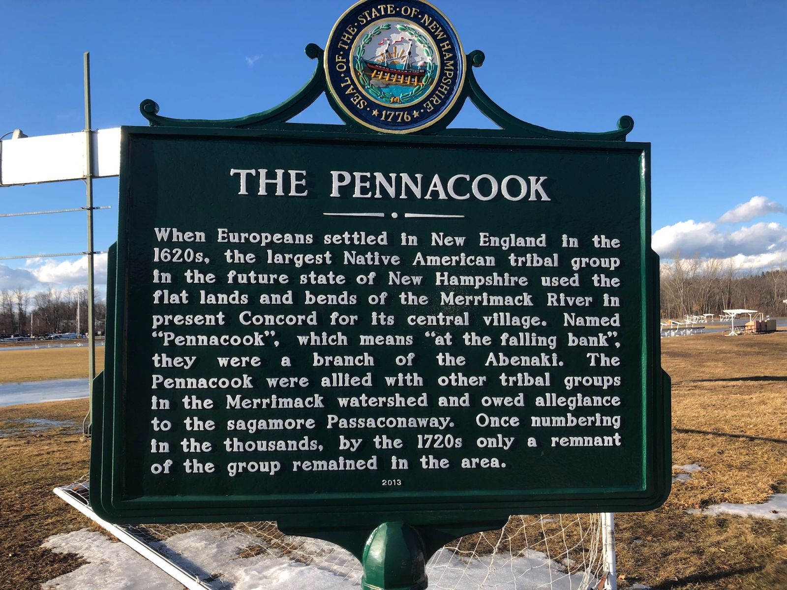 into the Abenaki. Photo of New Hampshire Pennacook historical marker, photographed by Douglas Finney, 08 February 2019, via HMdb.org |