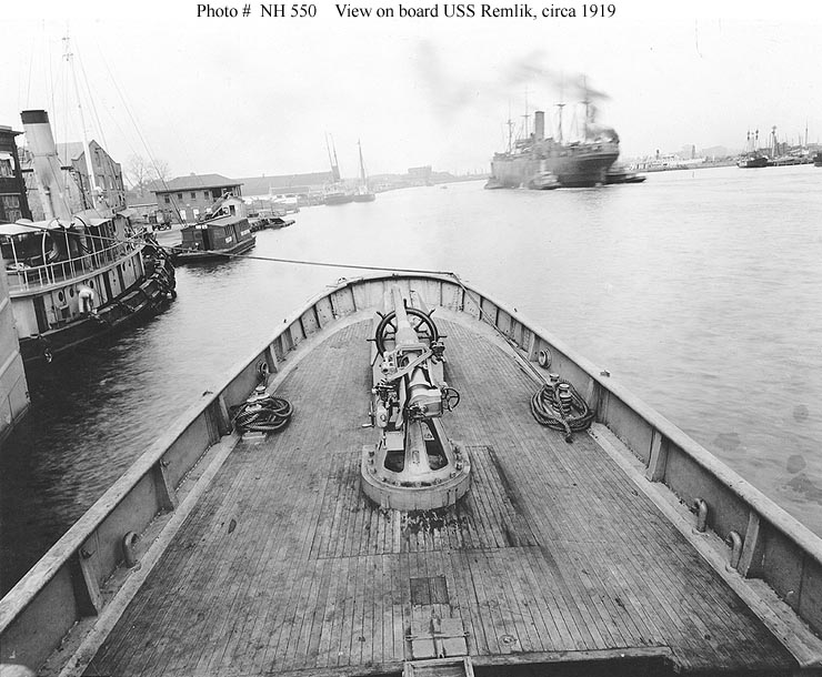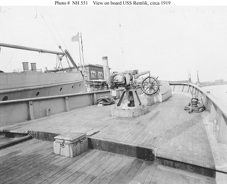 111k | USS Massasoit is visible in this view of USS Remlik (SP-157) looking aft from the superstructure, showing a three-inch gun and the steering wheel. Photographed at the Norfolk Navy Yard, VA., circa 1919.US Navy photos # NH 550 and NH 551 from the collections of the US Naval Historical Center. | US Naval Historical Center | |