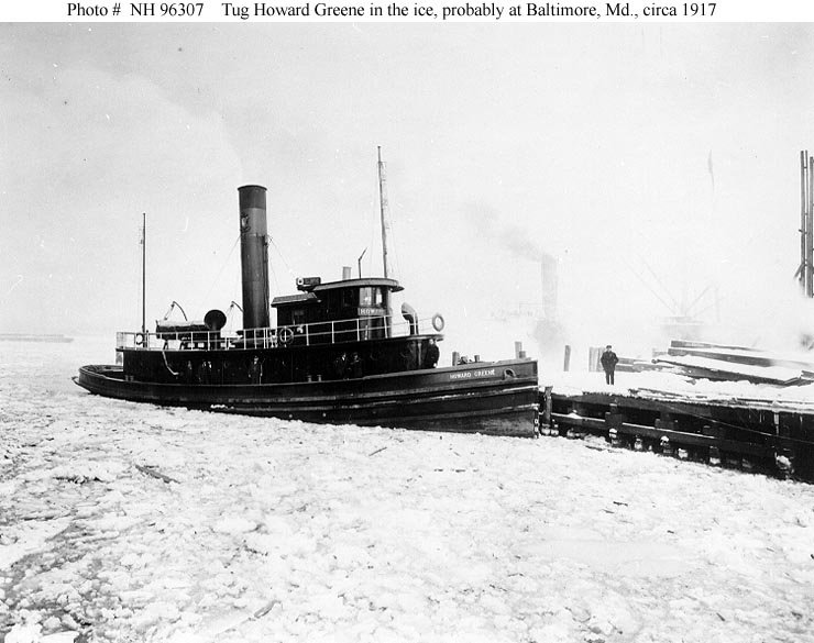 Howard Greene 75k The civilian tug Howard Greene photographed in the ice by her builder, the Baltimore Dry Docks & Shipbuilding Co., 1917.